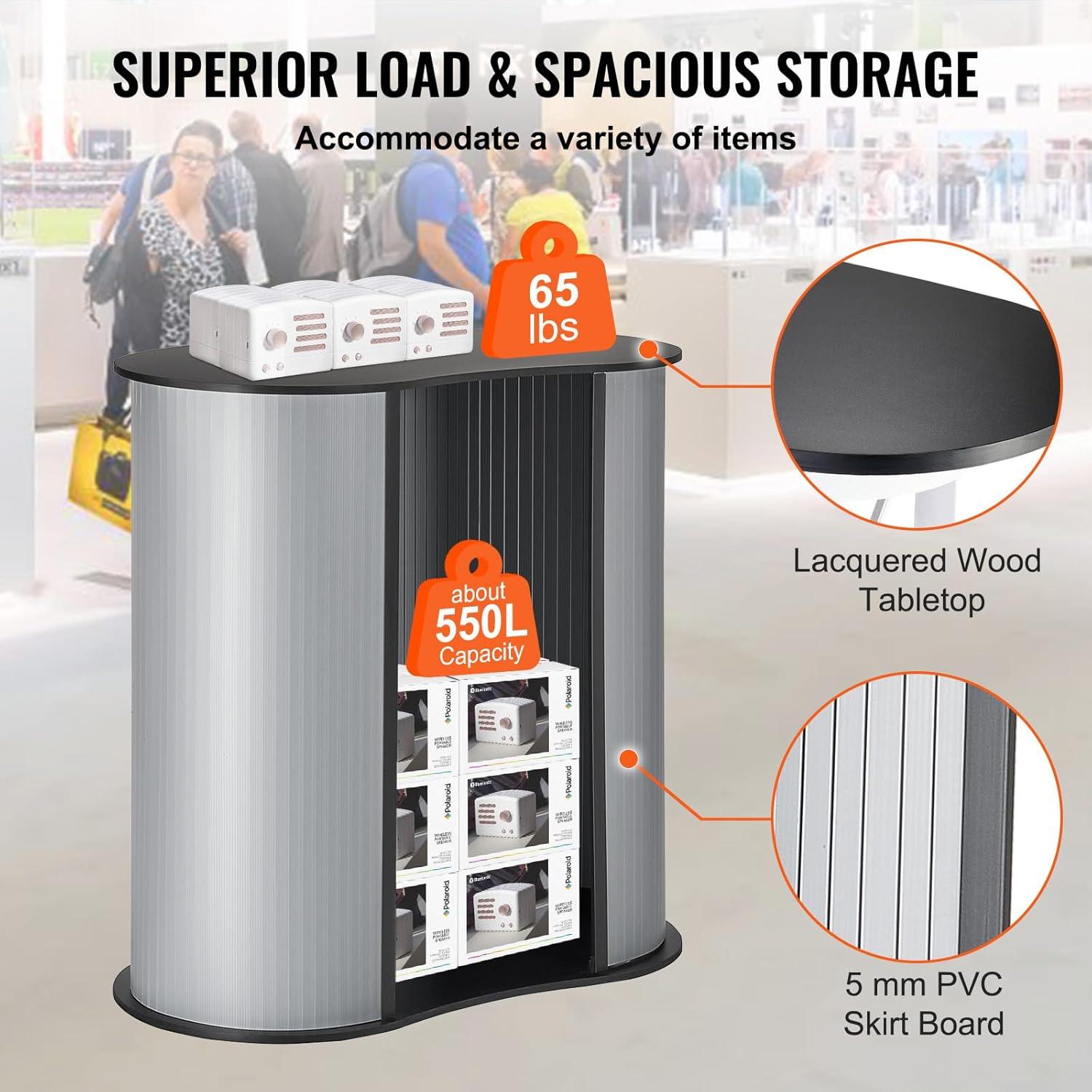 Superb Weight Capacity & Spacious Storage: The trade show counter supports up to 65 pounds on the tabletop with its large-capacity hollow storage space. The spacious storage accommodates various items, ensuring organized displays.