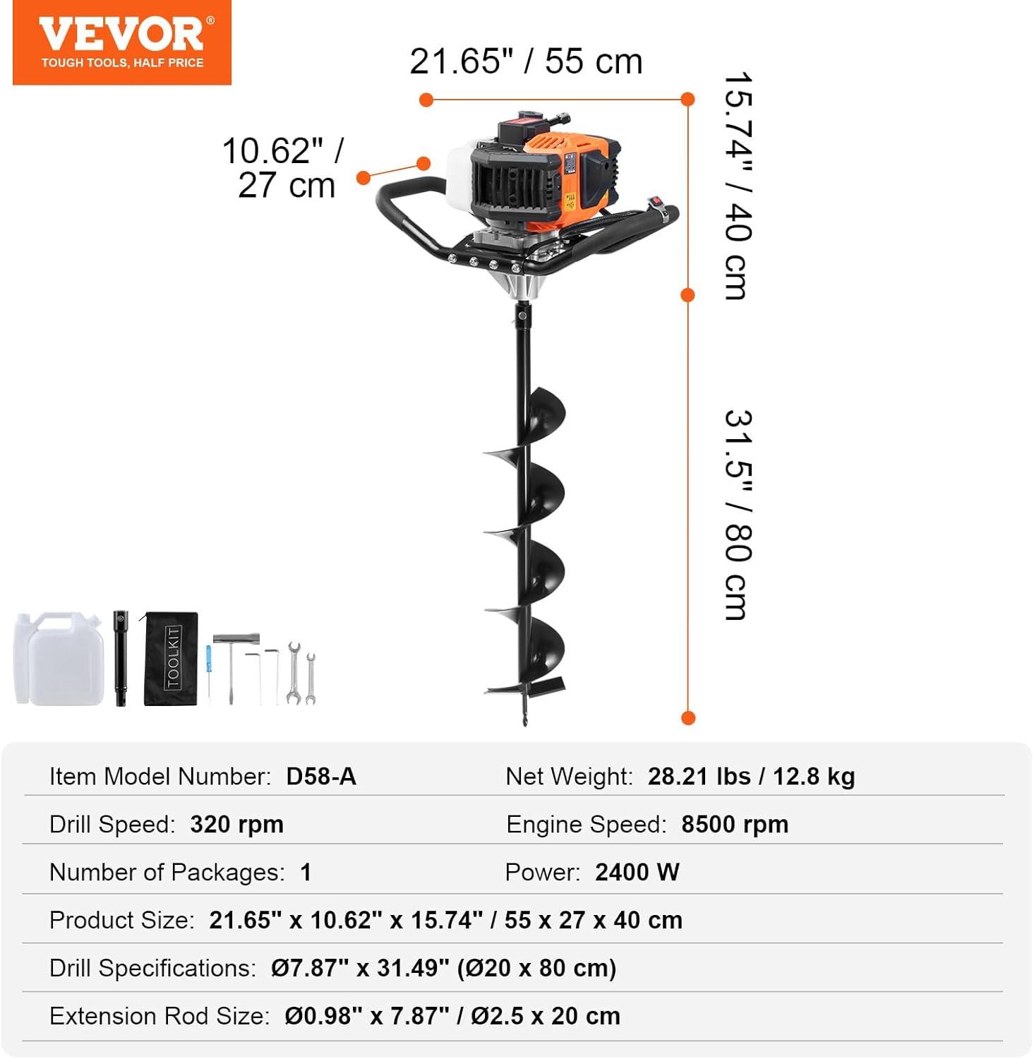 VEVOR Post Hole Digger, Gas Powered 52CC 1450W Earth Auger, 8' Drill Bit & 1 Ext Rod, Farm/ Garden Post Hole Digger, EPA Certified(63CC+8")