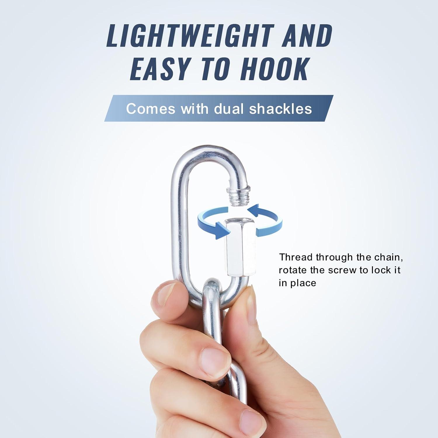 High Load Capacity: Our proof coil chain is designed to handle various heavy-duty hanging needs, supporting up to 350 lbs. Whether it's heavy equipment, mechanical parts, steel materials, or even your car, this chain makes it simple and secure, giving you peace of mind for all your hanging and suspension tasks.