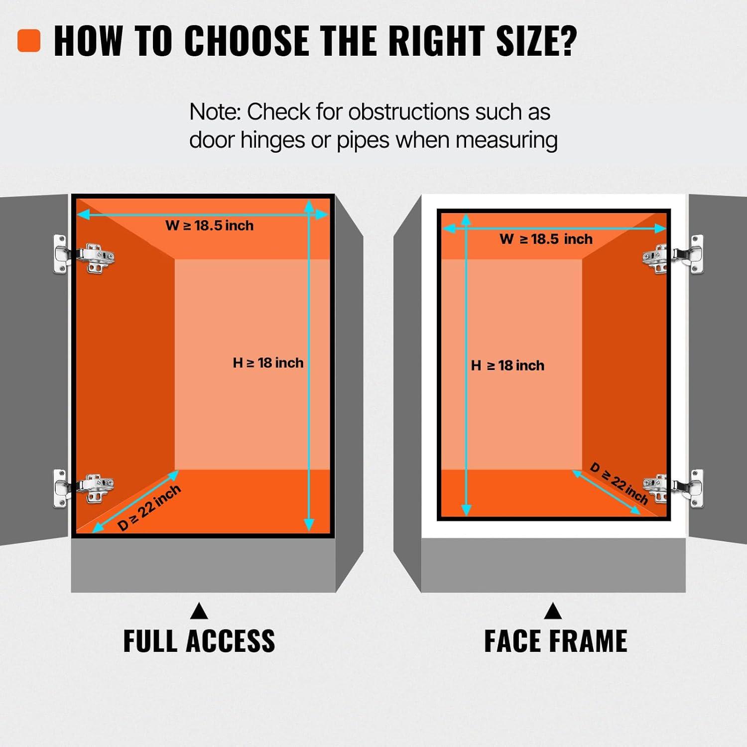 Product Size: 12″Wx21″Dx15″H; Cabinet Installation Size: 13.5″Wx22″Dx18″H. Note: Check for obstructions such as door hinges or pipes when measuring.