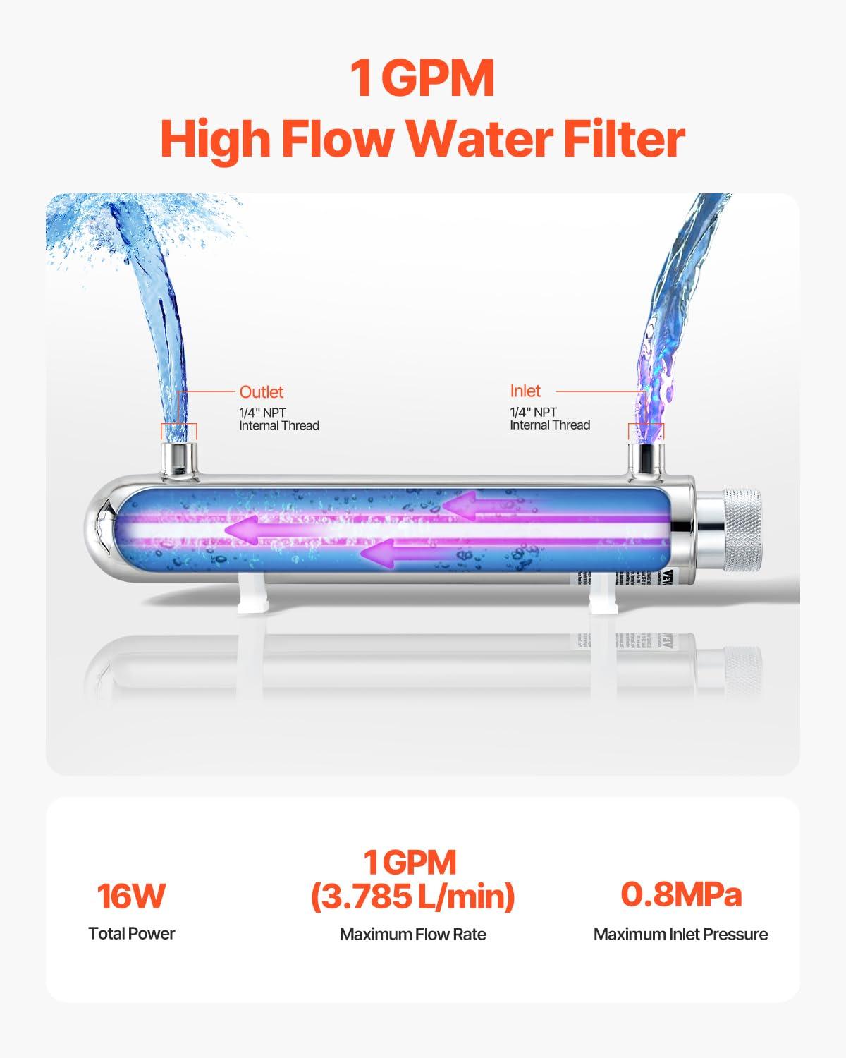 VEVOR Purifier UV water, 55 W, 12 GPM, 110 V, versatile ultraviolet water purification filter with stainless steel housing, UV water filter for the whole house with quartz sleeve(1 GPM)