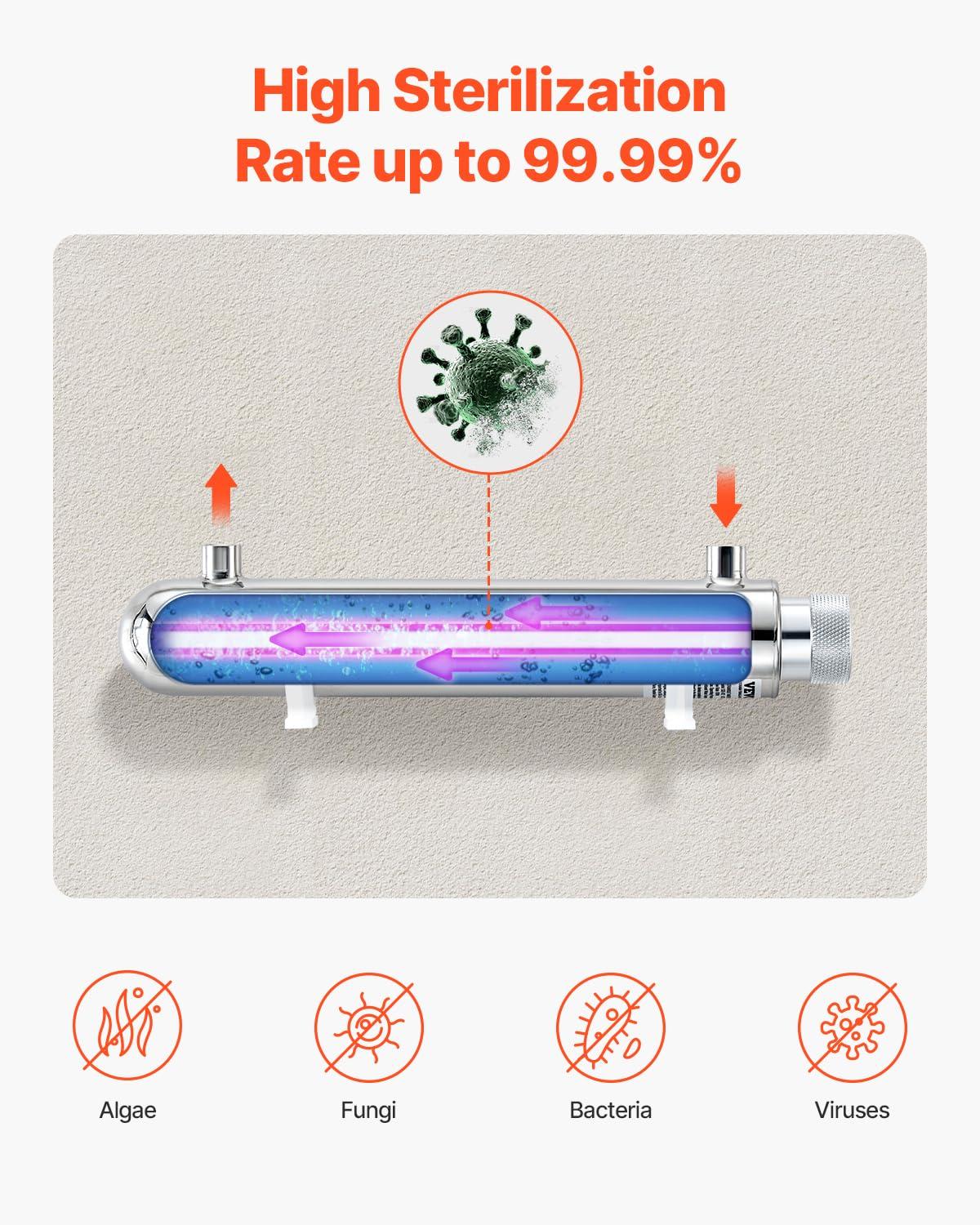 VEVOR Purifier UV water, 55 W, 12 GPM, 110 V, versatile ultraviolet water purification filter with stainless steel housing, UV water filter for the whole house with quartz sleeve(12 GPM)
