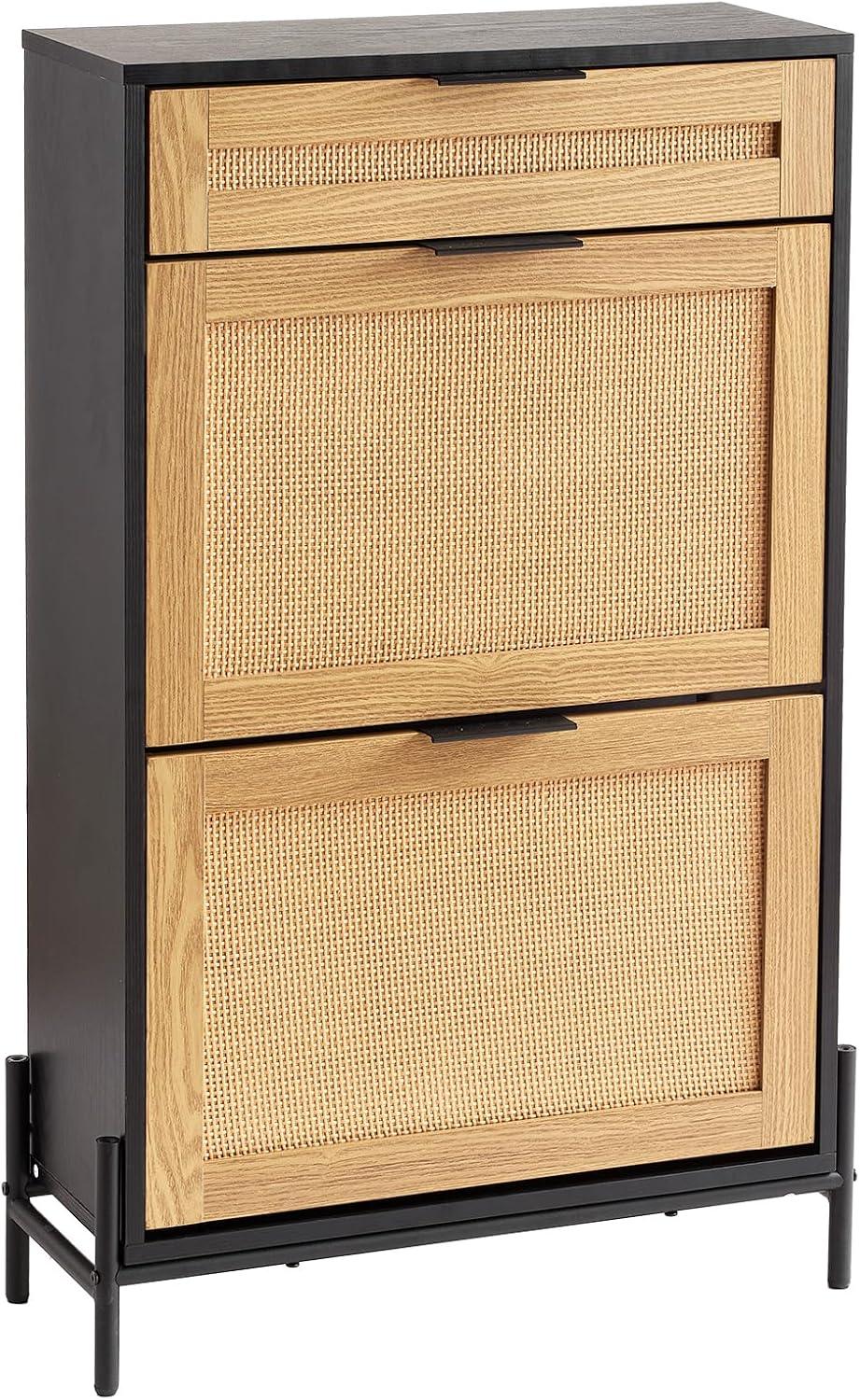 VEVOR Rattan Shoe Cabinet, Narrow Shoe Storage Organizer with 2 Flip Rattan Drawers & 1 Slide Drawer, Metal Legs, Slim Shoe Entryway Cabinet Ideal for Entryway, Closet, Hallway, Black(Light Wood Color)