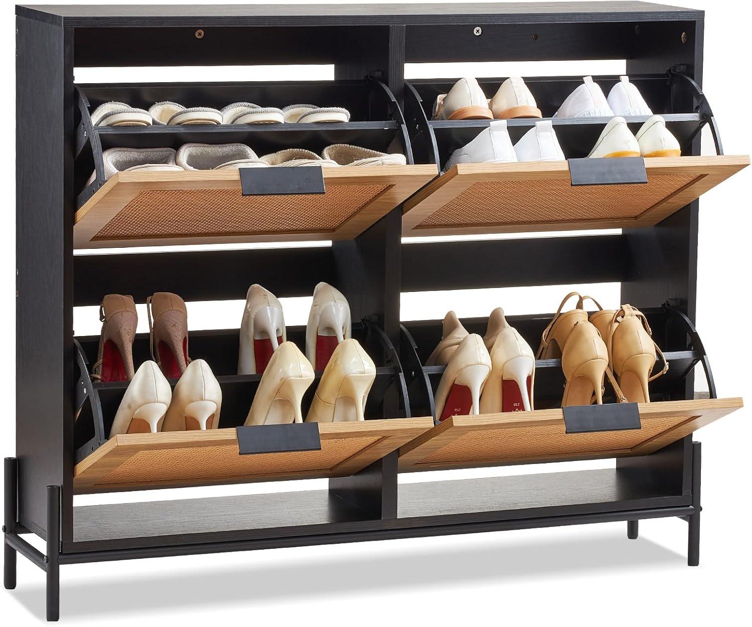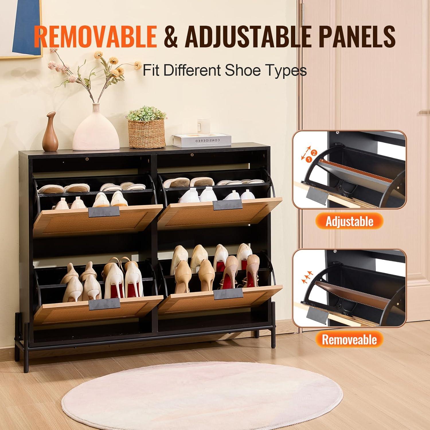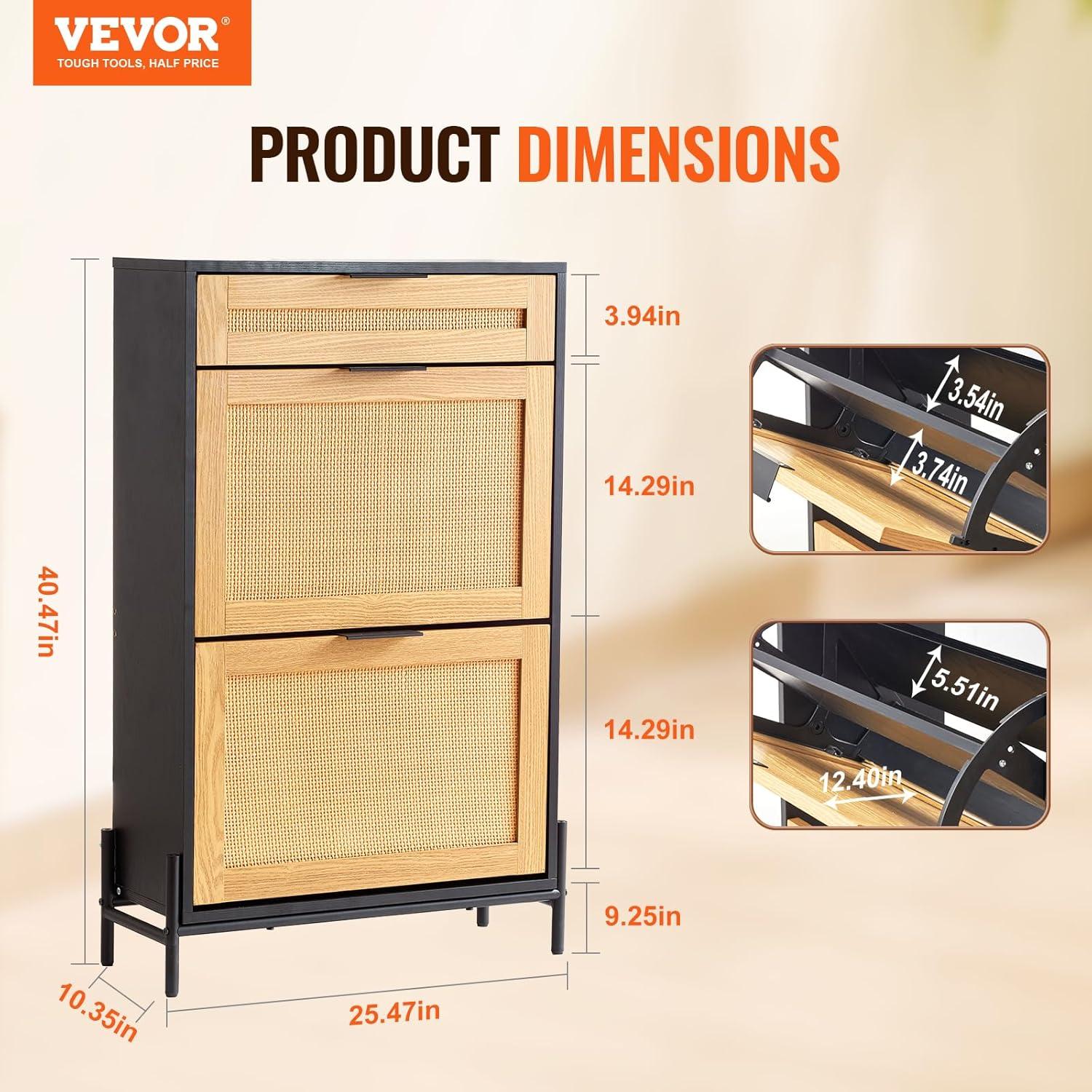 VEVOR Rattan Shoe Cabinet, Narrow Shoe Storage Organizer with 2 Flip Rattan Drawers & 1 Slide Drawer, Metal Legs, Slim Shoe Entryway Cabinet Ideal for Entryway, Closet, Hallway, Black(Black)