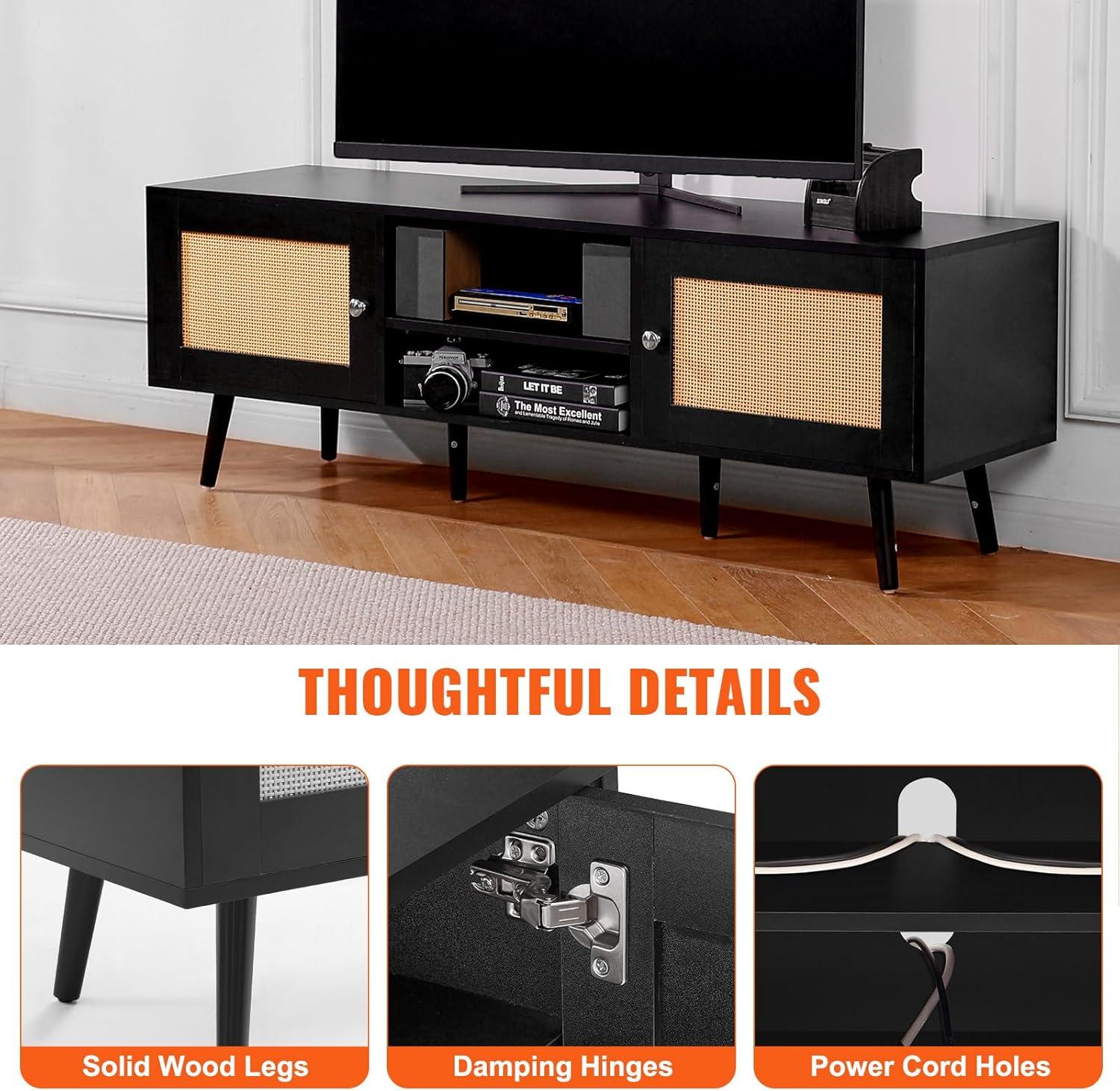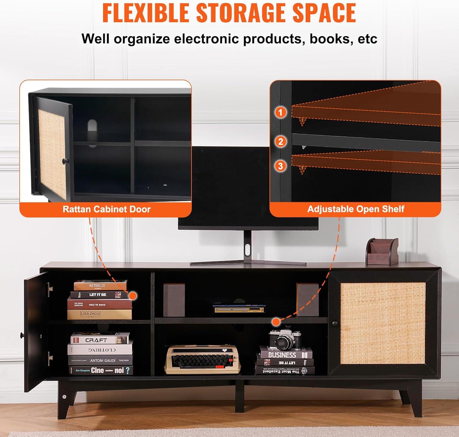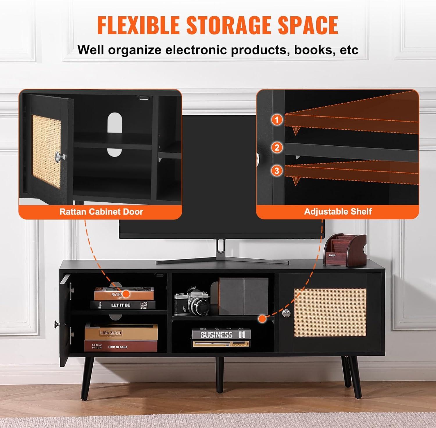 VEVOR Rattan TV Stand, Boho TV Cabinet for 55 inch TV, Mid Century Modern TV Stand, Rattan TV Console with Adjustable Shelfs for Living Room, Media Room, Black(Black)