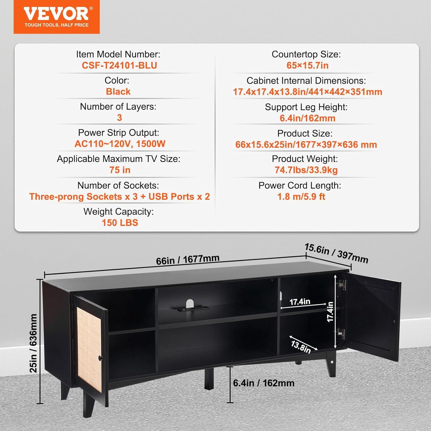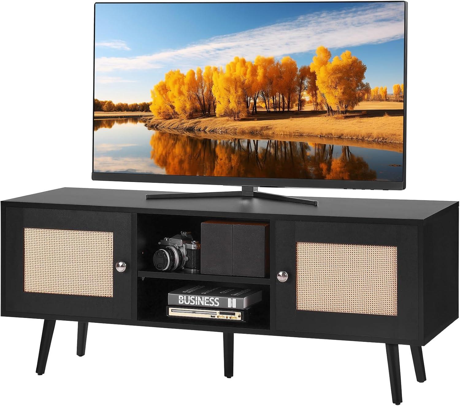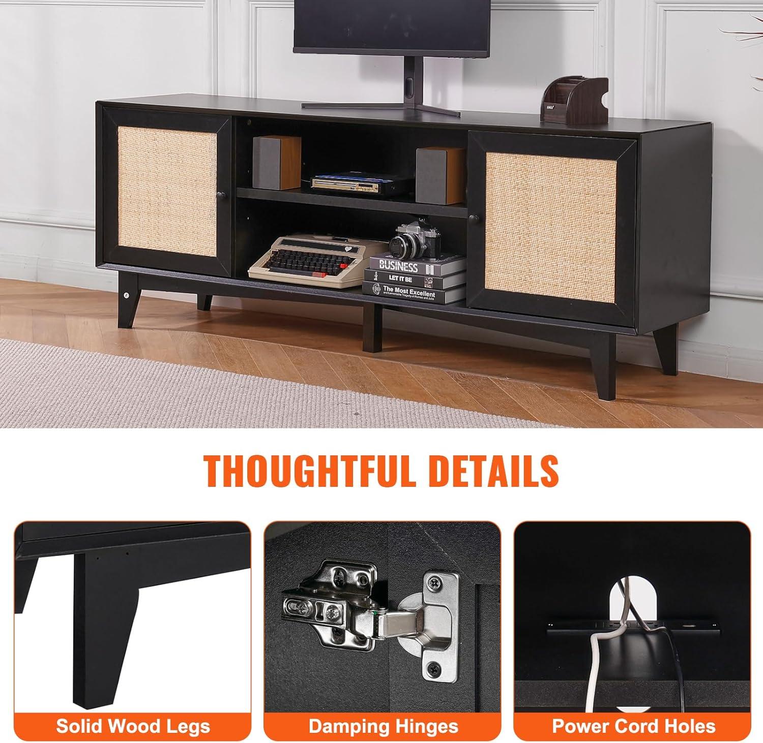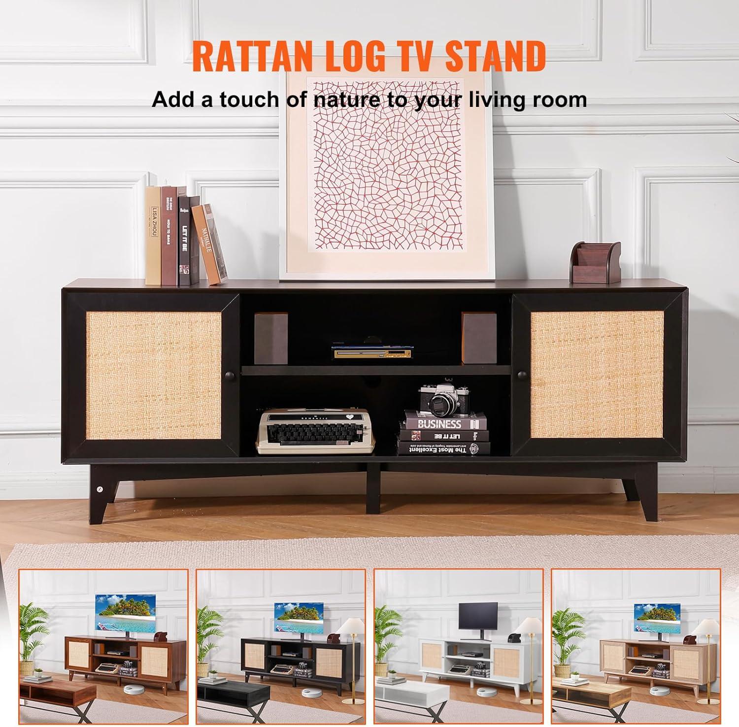 VEVOR Rattan TV Stand, Boho TV Cabinet for 55 inch TV, Mid Century Modern TV Stand, Rattan TV Console with Adjustable Shelfs for Living Room, Media Room, Black(Black)