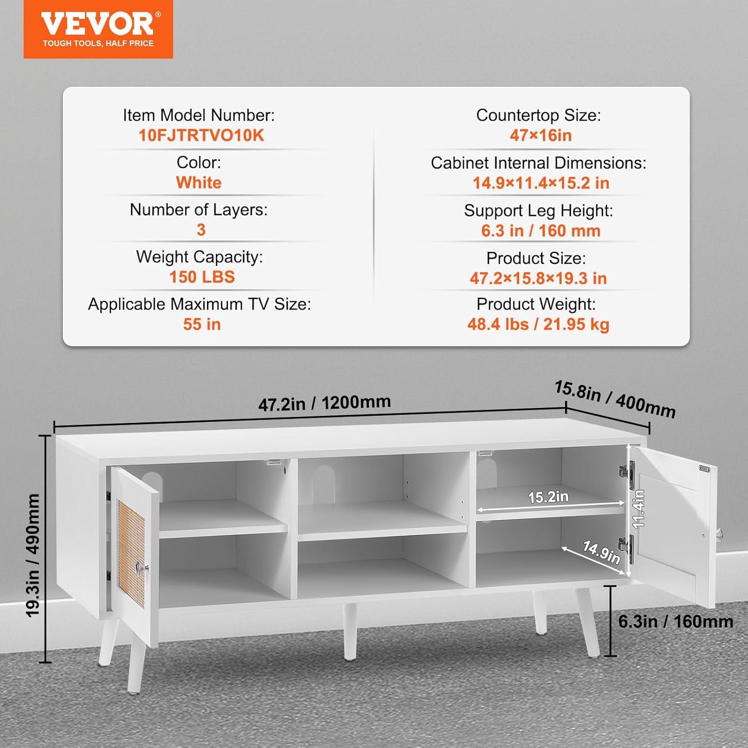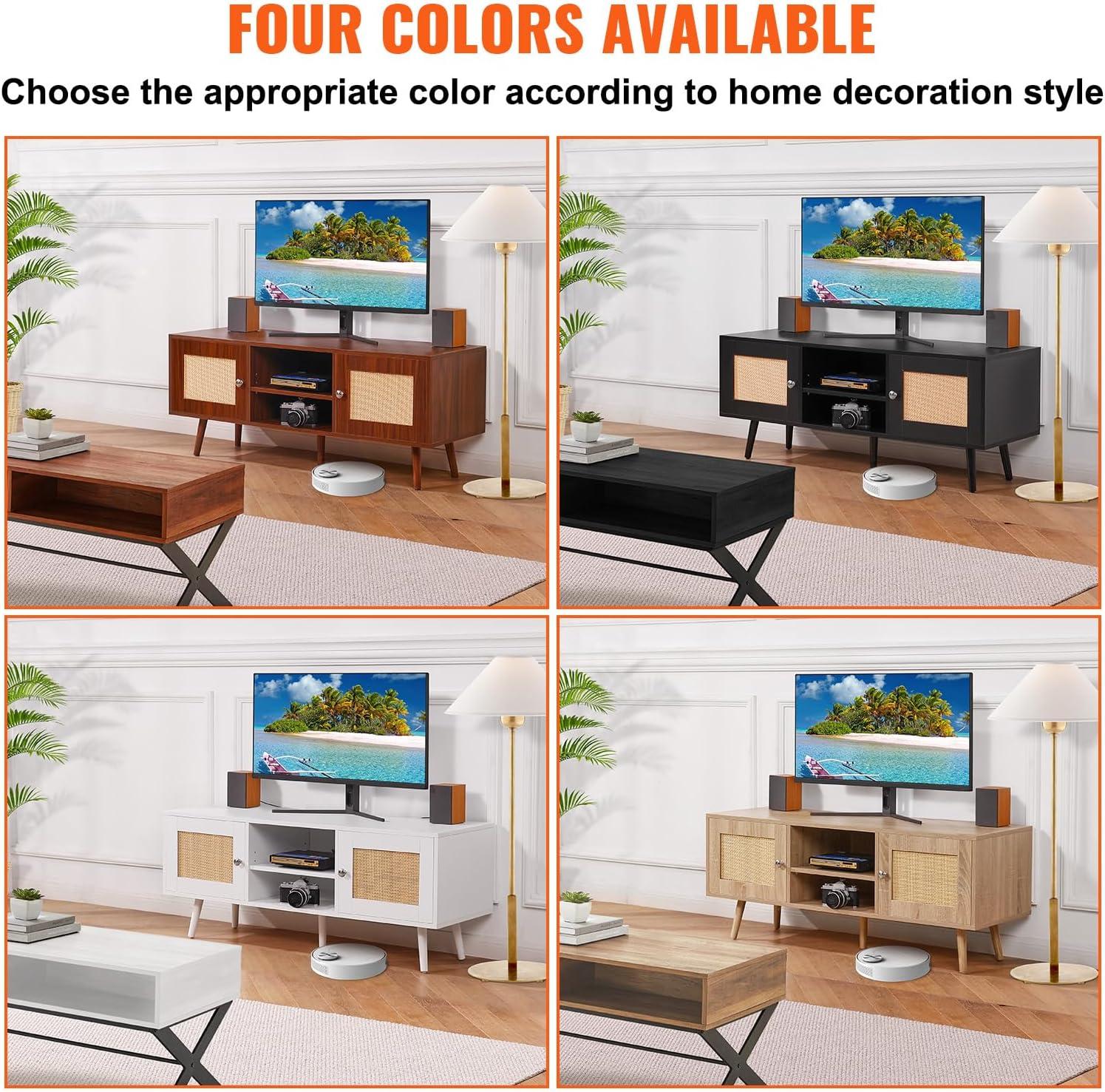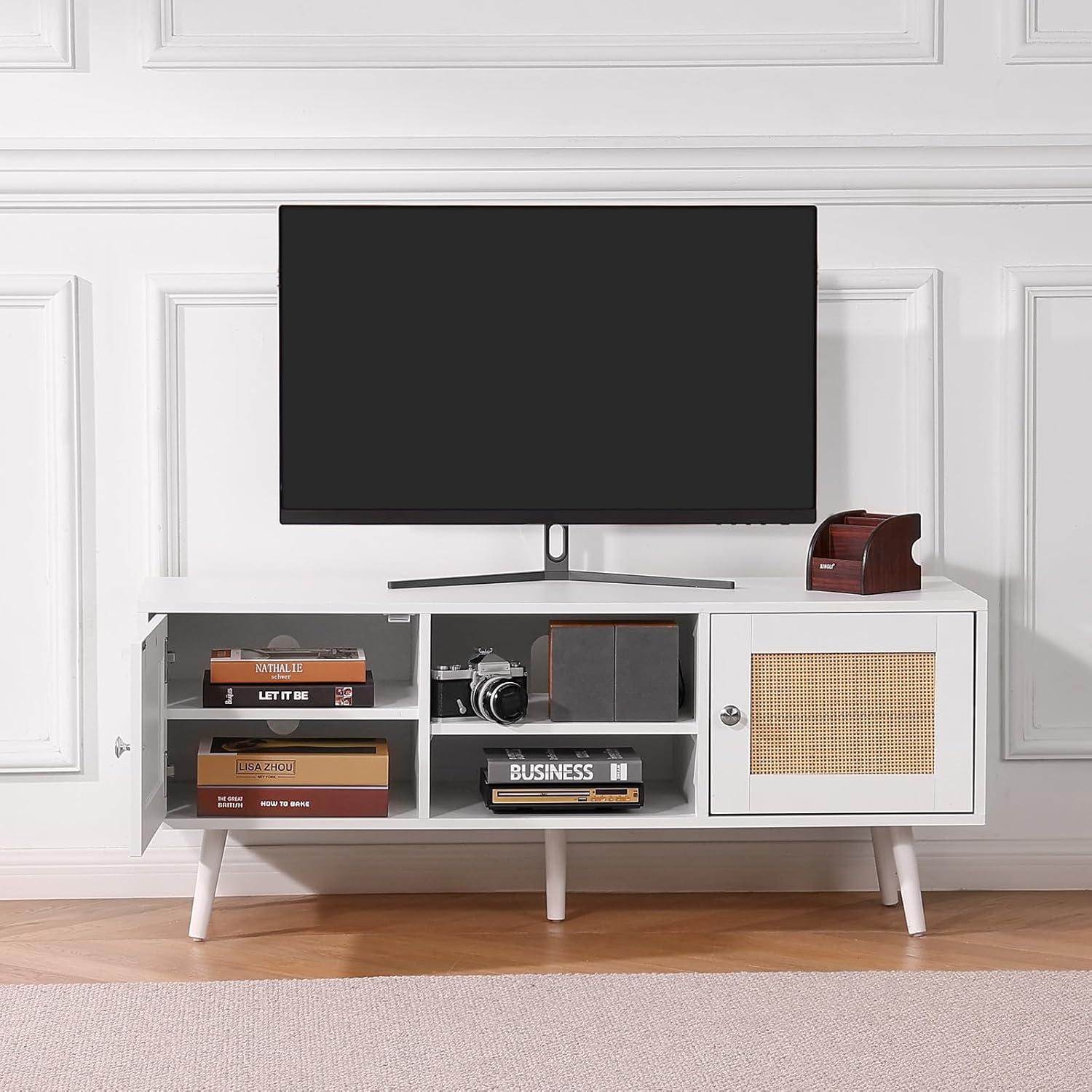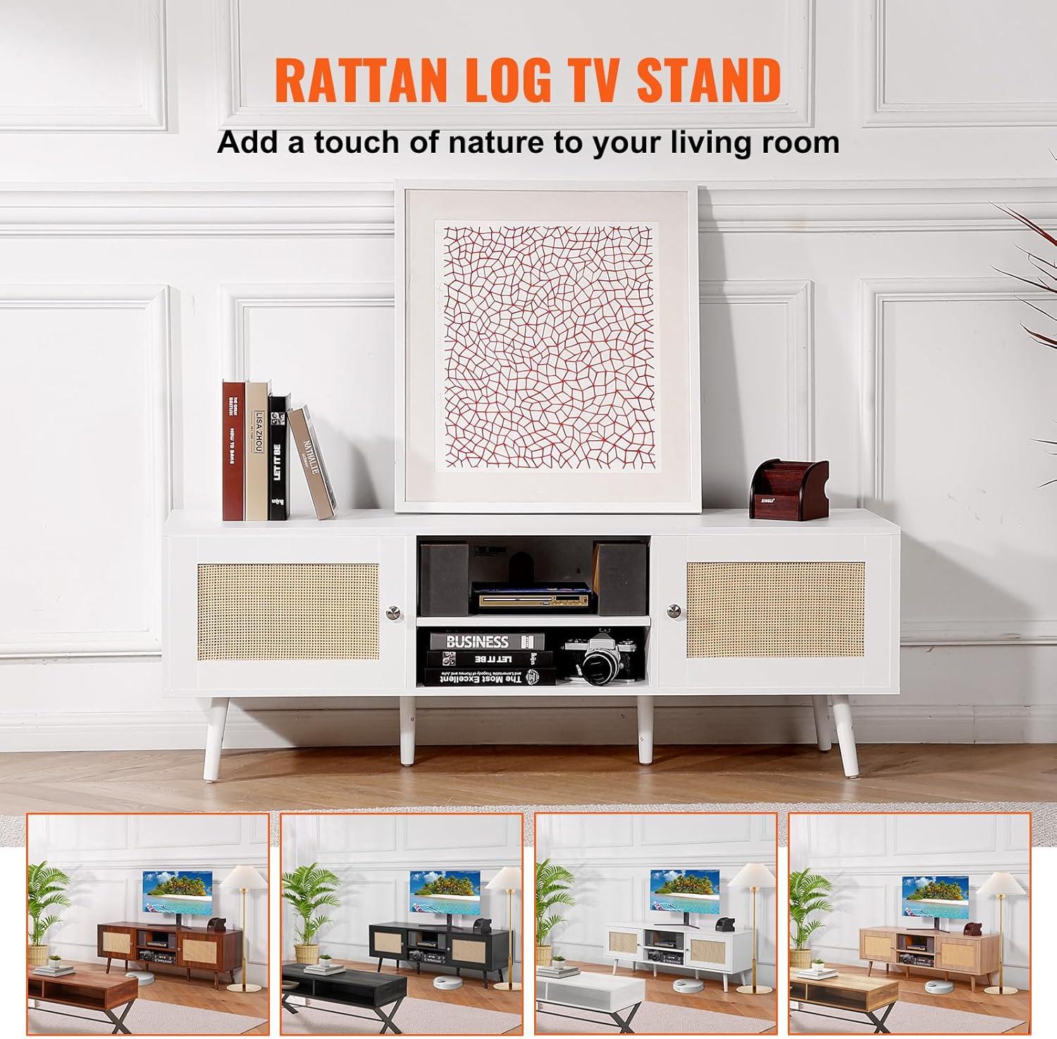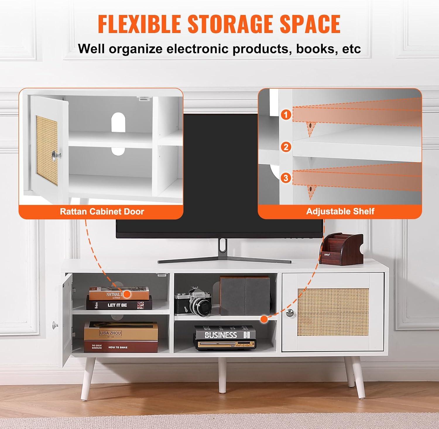 VEVOR Rattan TV Stand, Boho TV Cabinet for 55 inch TV, Mid Century Modern TV Stand, Rattan TV Console with Adjustable Shelfs for Living Room, Media Room, Black(White)