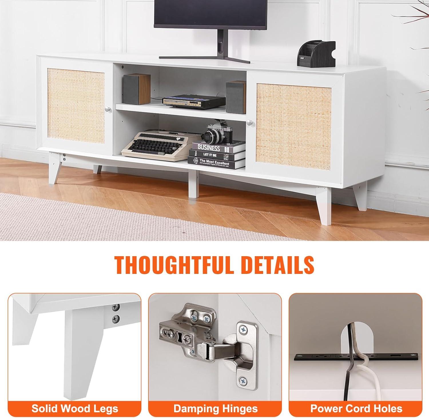 User-Centric Features: The rattan TV cabinet stands on five solid wood legs, offering strong support and a 6.3-inch clearance for easy cleaning, even accommodating a robot vacuum. Three cable management holes help you keep wires organized, while dampers on the hinges ensure the doors close quietly and smoothly.