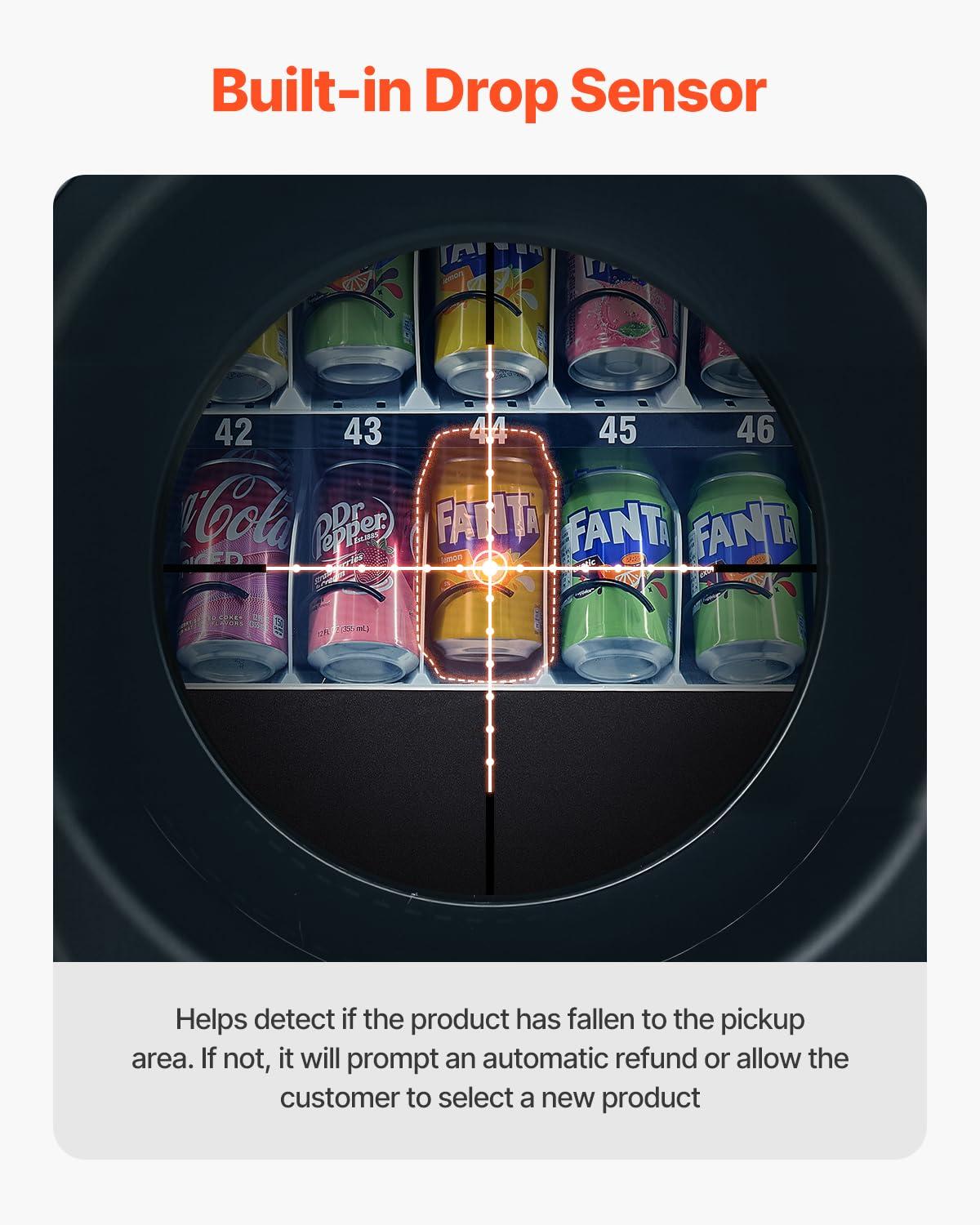 Drop Sensor: The snack vending machine is equipped with a drop sensor that helps detect the product dispensing process. If no product is detected after payment, a refund will be issued to the consumer. It also enhances security by preventing machine damage or consumer injury caused by product drops