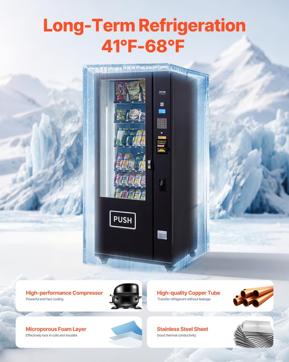 Support Multiple Payment Options: Equipped with ICT bill/coin acceptor, the combo vending machine supports both bill payments ($1, $5, $10, $20) and coin payments ($0.01, $0.05, $0.10, $1). It features fast acceptance speed, high recognition accuracy, and advanced anti-counterfeiting technology