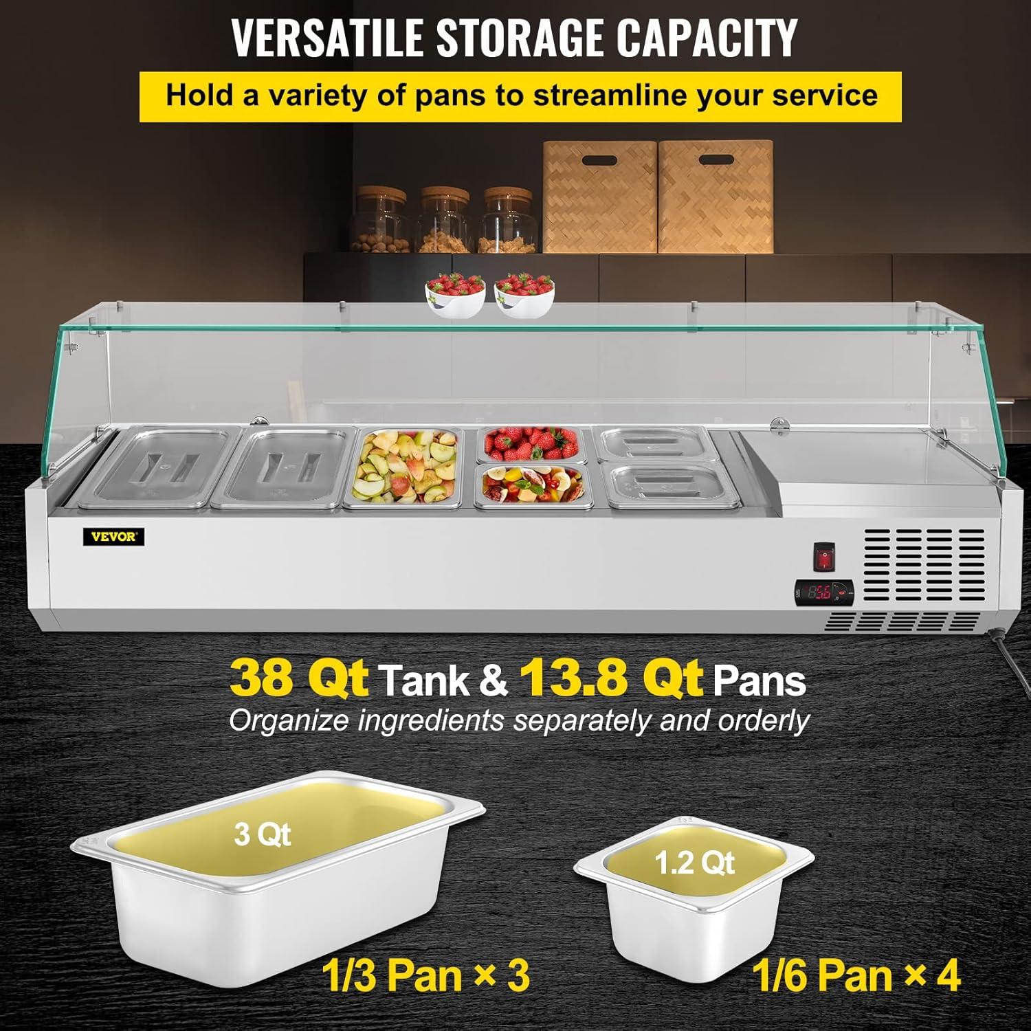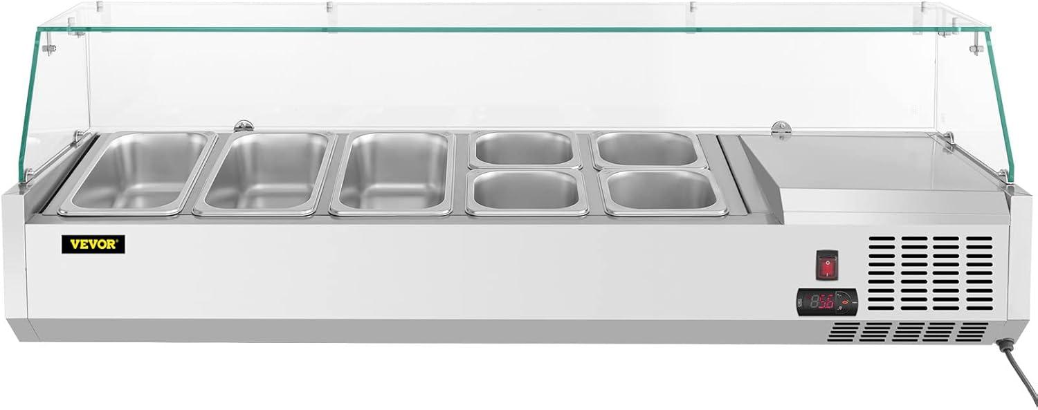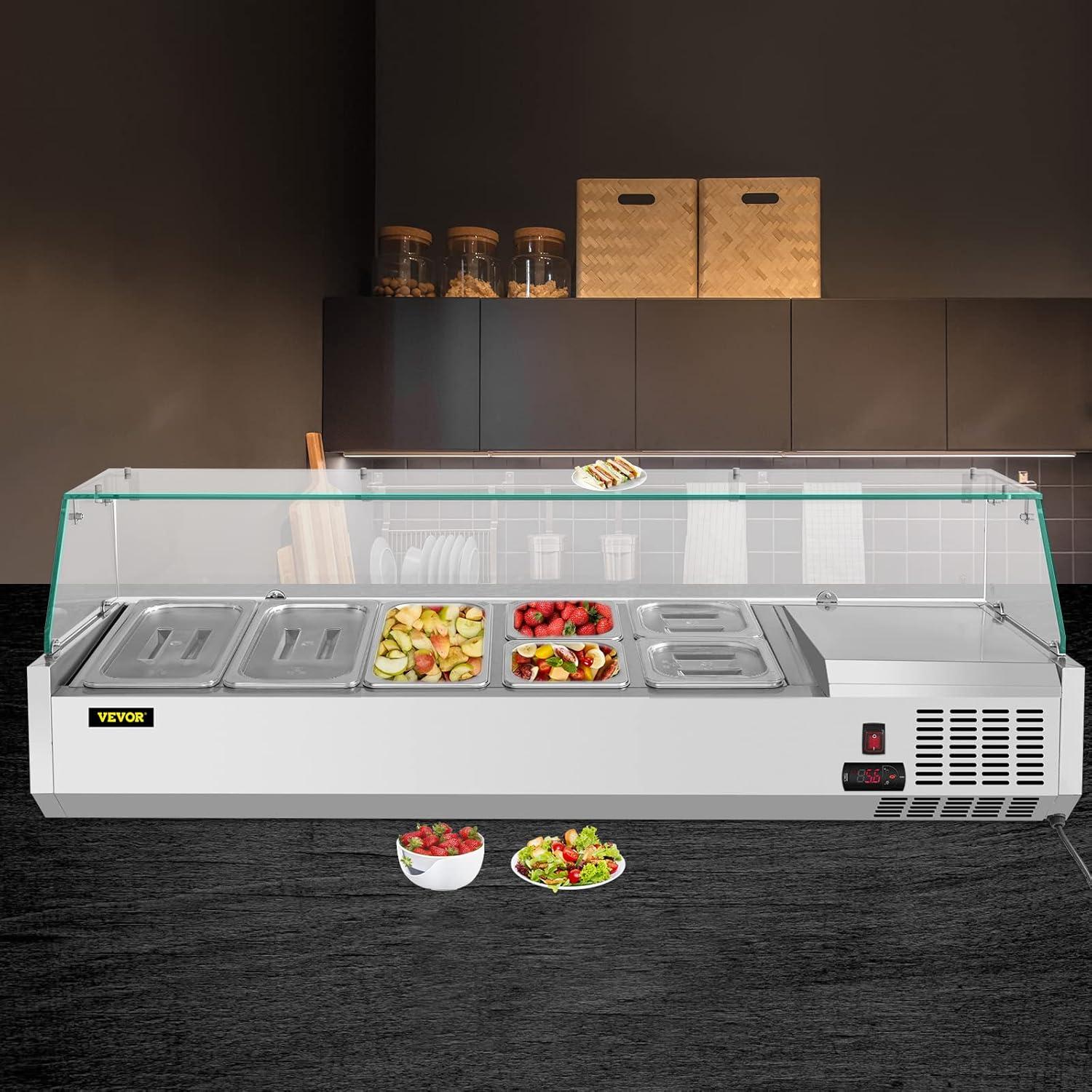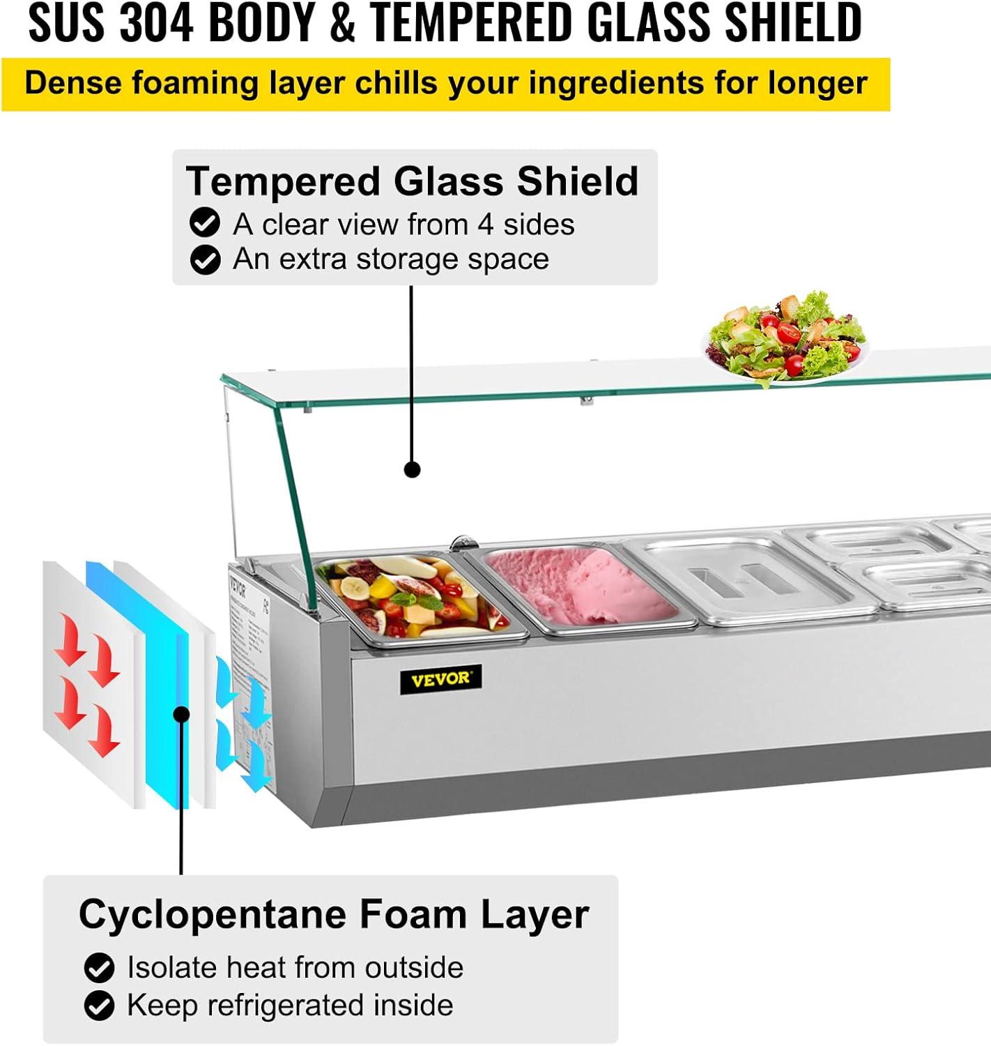VEVOR Refrigerated Condiment Prep Station, 135 W Countertop Refrigerated Condiment Station, with 2 1/3 Pans & 4 1/6 Pans, 304 Stainless Body and PC Lid, Sandwich Prep Table with Stainless Guard, ETL(1 Count (Pack of 1))