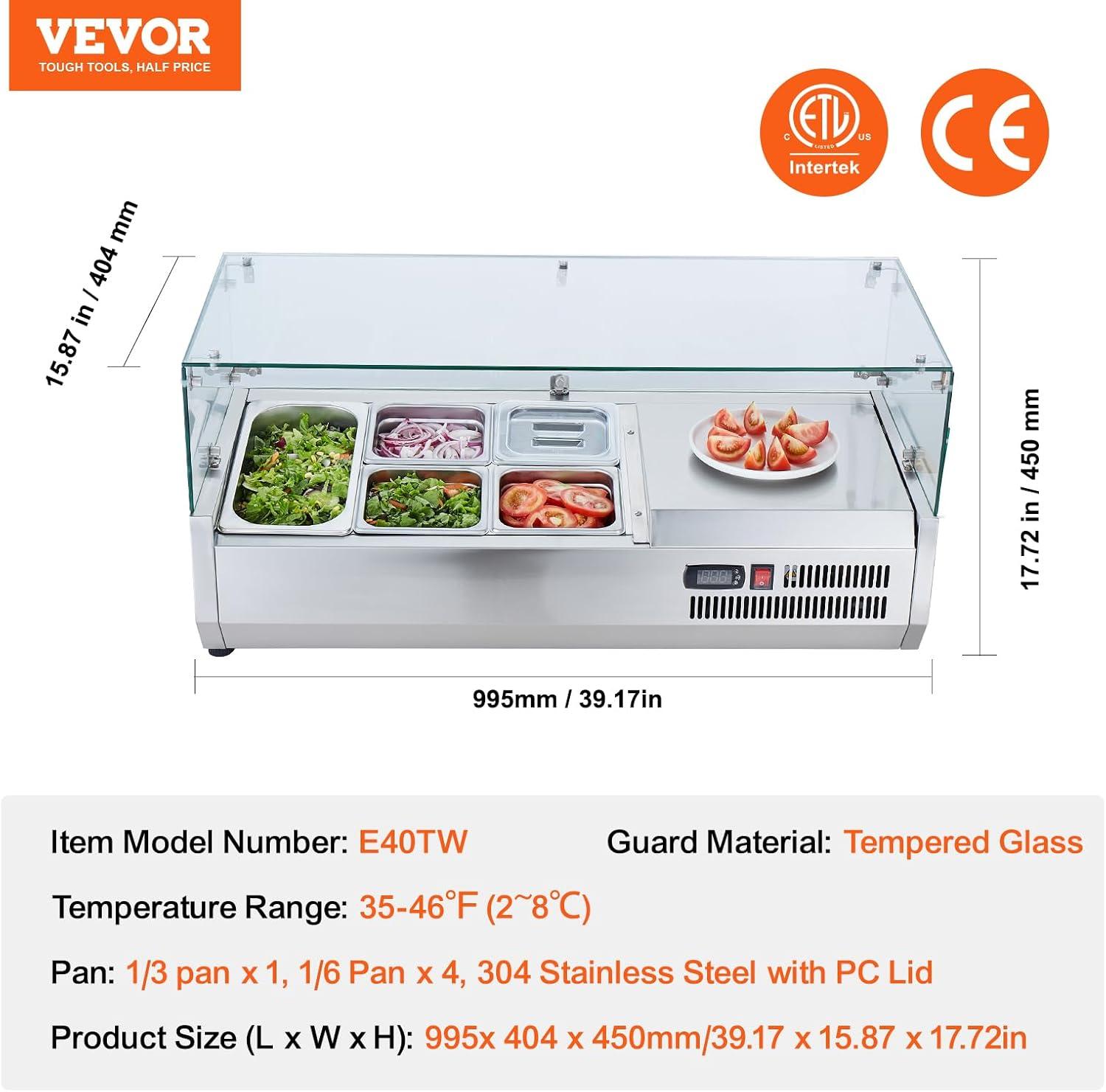 VEVOR Refrigerated Condiment Prep Station, 135 W Countertop Refrigerated Condiment Station, with 2 1/3 Pans & 4 1/6 Pans, 304 Stainless Body and PC Lid, Sandwich Prep Table with Stainless Guard, ETL(40 in)