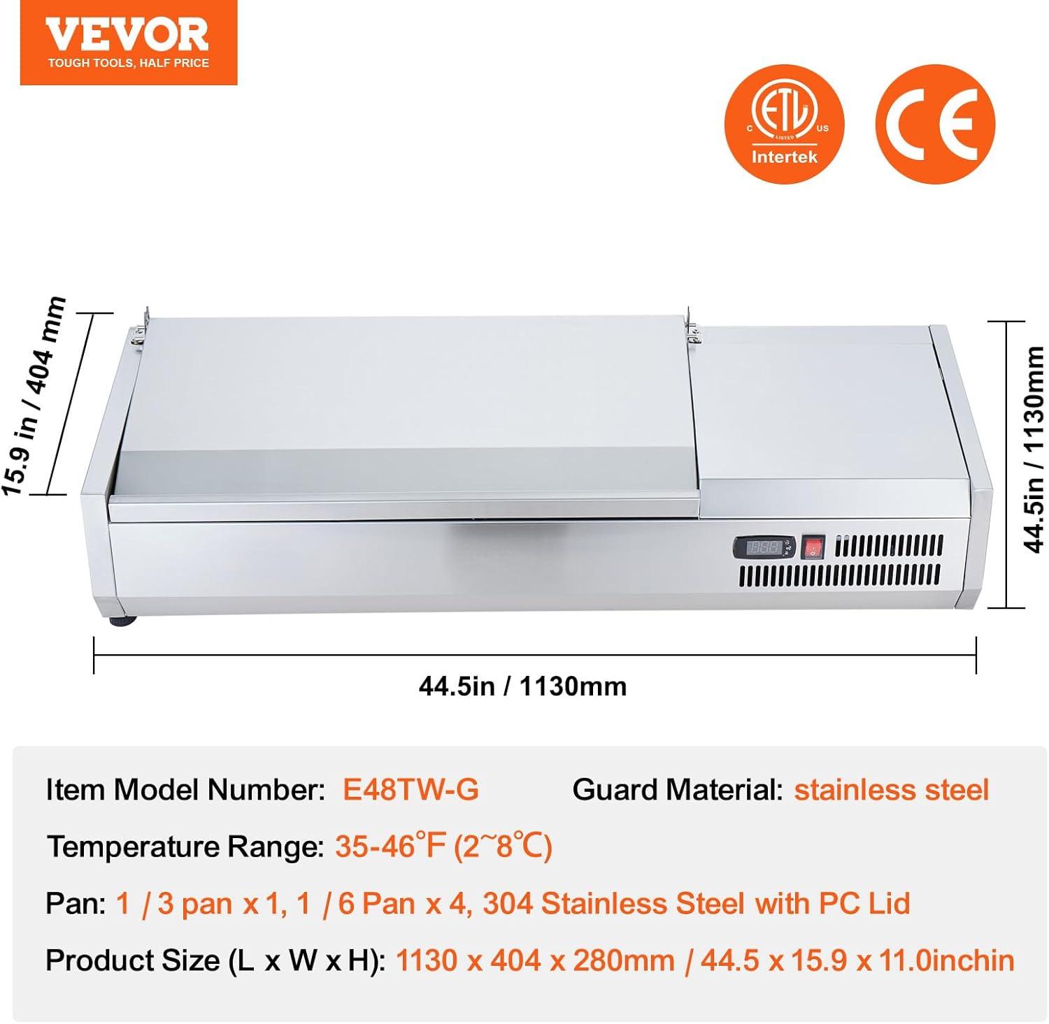 imageVEVOR Refrigerated Condiment Prep Station 135 W Countertop Refrigerated Condiment Station with 2 13 Pans ampamp 4 16 Pans 304 Stainless Body and PC Lid Sandwich Prep Table with Stainless Guard ETLStainless 48in