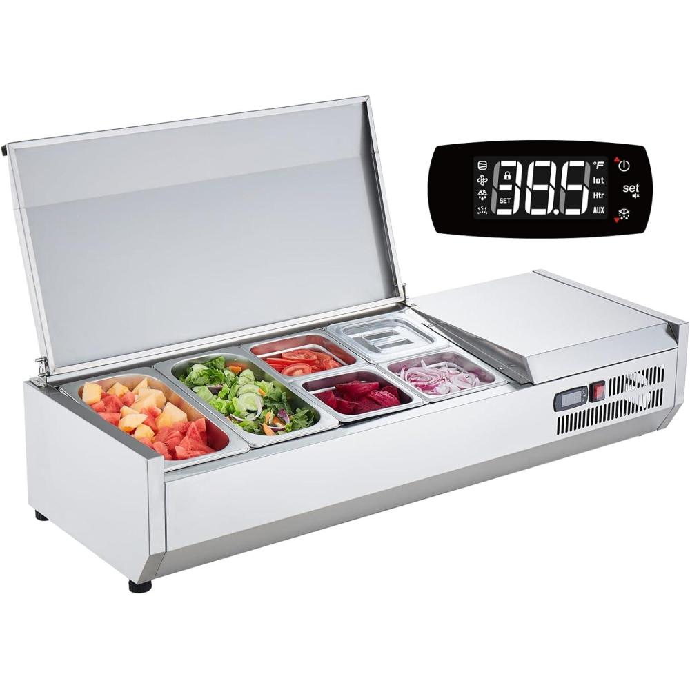 VEVOR Refrigerated Condiment Prep Station, 135 W Countertop Refrigerated Condiment Station, with 2 1/3 Pans & 4 1/6 Pans, 304 Stainless Body and PC Lid, Sandwich Prep Table with Stainless Guard, ETL(Stainless 48in)