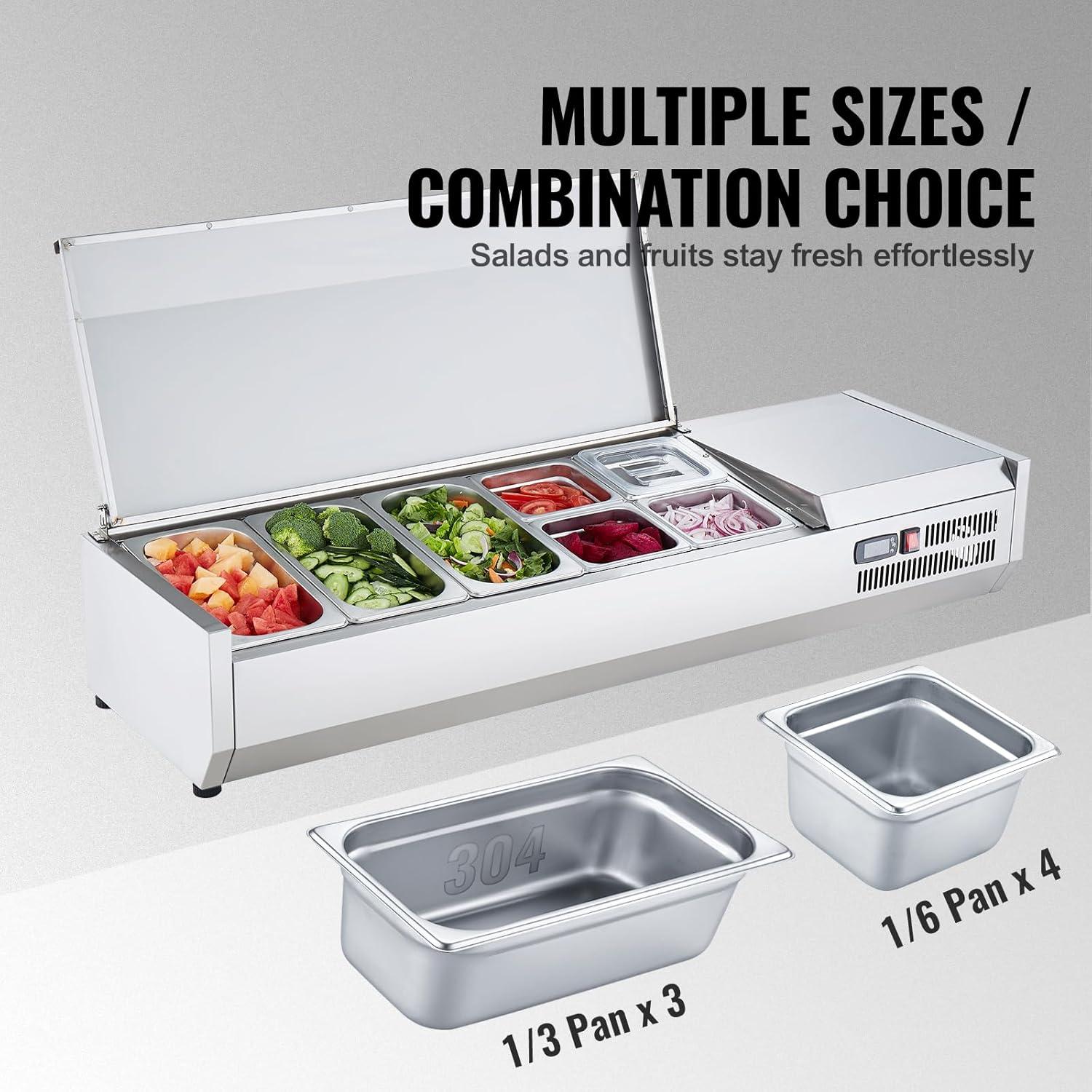 VEVOR Refrigerated Condiment Prep Station, 135 W Countertop Refrigerated Condiment Station, with 2 1/3 Pans & 4 1/6 Pans, 304 Stainless Body and PC Lid, Sandwich Prep Table with Stainless Guard, ETL(Stainless 55)