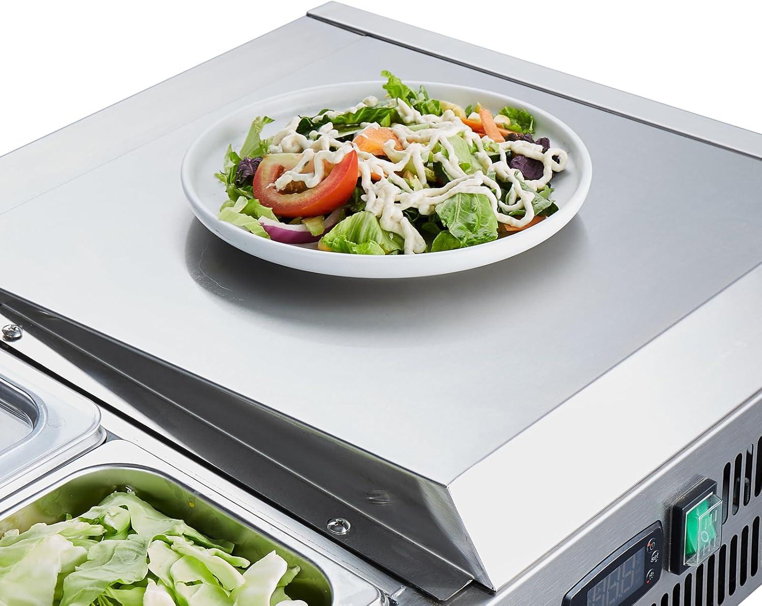 Stainless Steel Guard: Our refrigerated condiment station equipped with a removable stainless steel hinged lid for easy access, further preventing dust, dirt from entering, locking in the cold to keep food fresh and clean when not in use.