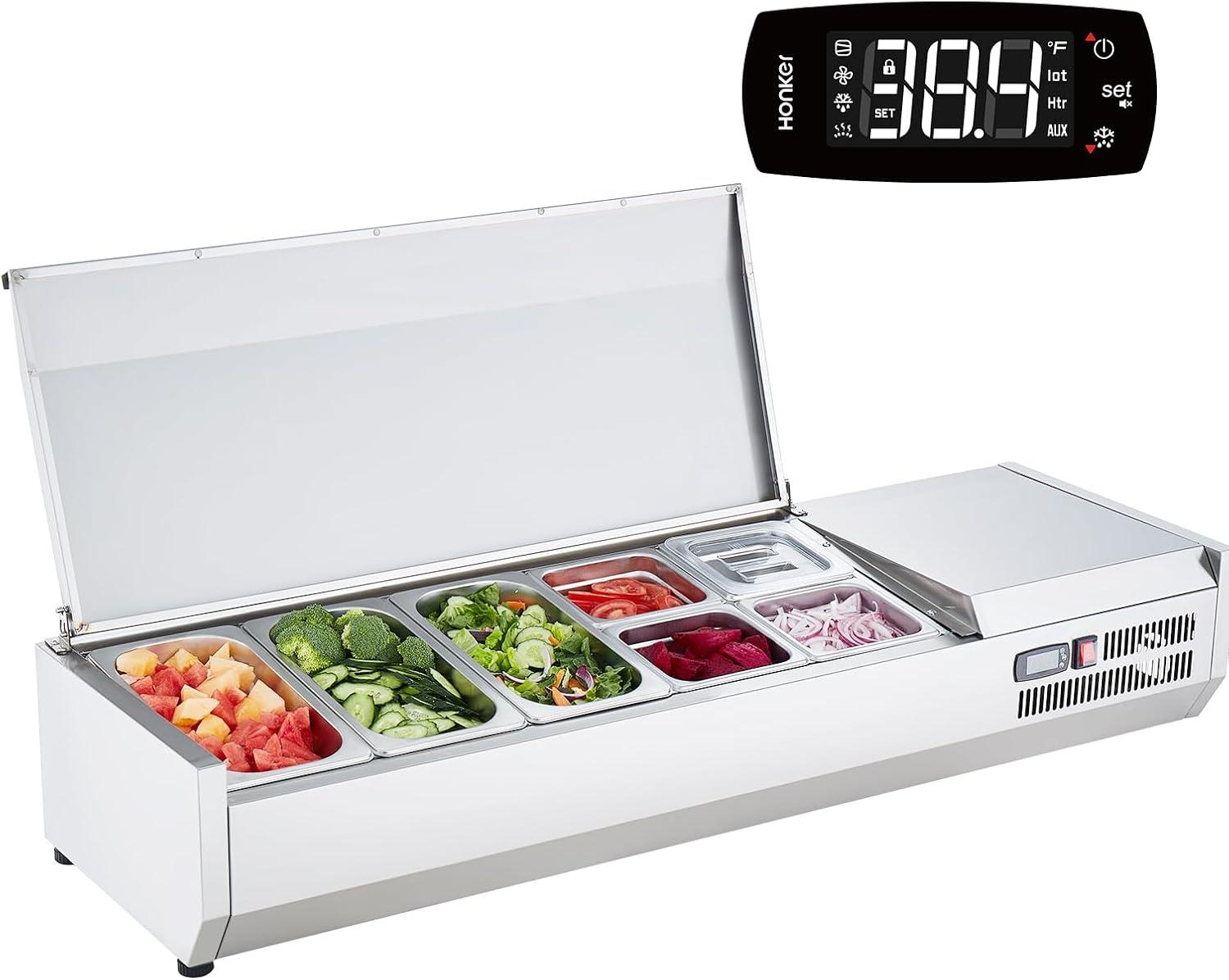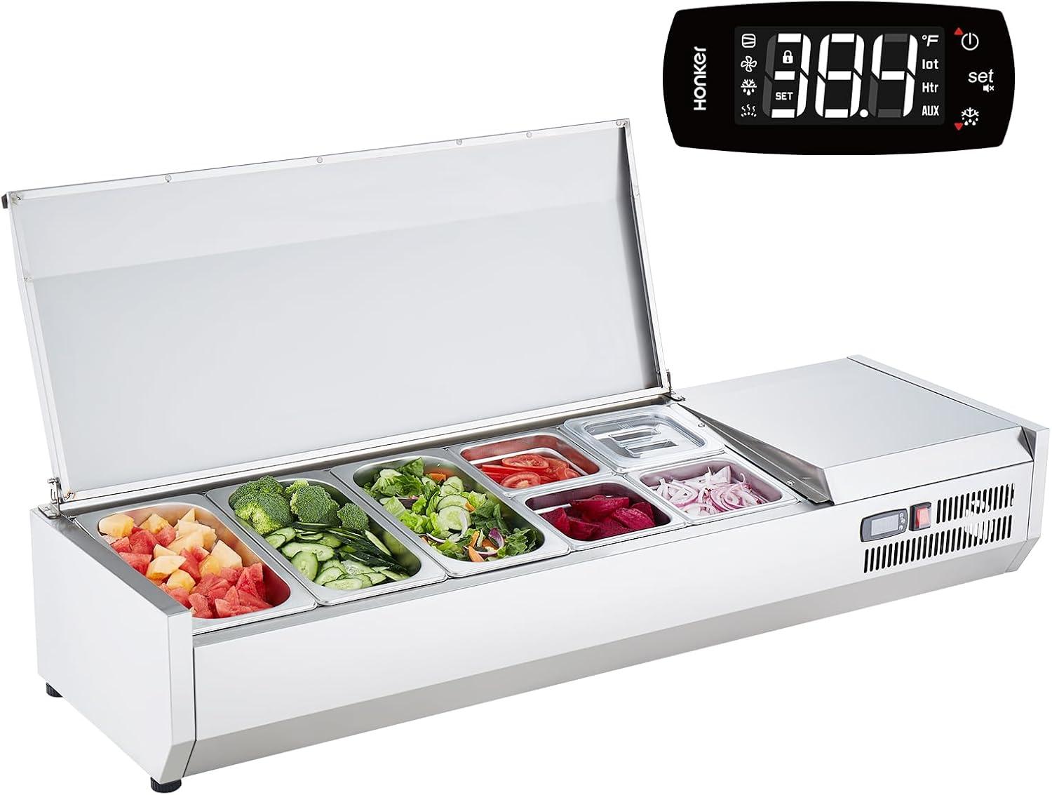 Modular Tray System: Our refrigerated condiment station features 2 1/3 pans and 4 1/6 pans, increasing capacity for flexible use. Removable dividers help you reasonably segregate the areas to prevent flavor crossover and keep ingredients fresher. Made from 304 stainless steel and includes PC material bins with sealing lids to prevent dust. Safe and reliable, you can also choose different sized pans as needed to meet your diverse food storage & display requirements.