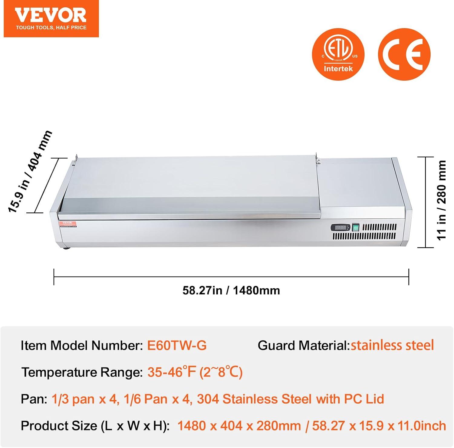 imageVEVOR Refrigerated Condiment Prep Station 135 W Countertop Refrigerated Condiment Station with 2 13 Pans ampamp 4 16 Pans 304 Stainless Body and PC Lid Sandwich Prep Table with Stainless Guard ETLStainless 60in