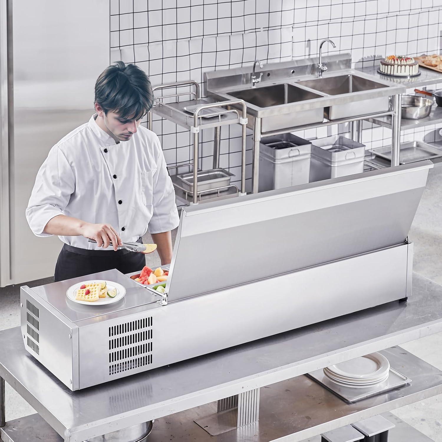 VEVOR Refrigerated Condiment Prep Station, 135 W Countertop Refrigerated Condiment Station, with 2 1/3 Pans & 4 1/6 Pans, 304 Stainless Body and PC Lid, Sandwich Prep Table with Stainless Guard, ETL(Stainless 60in)