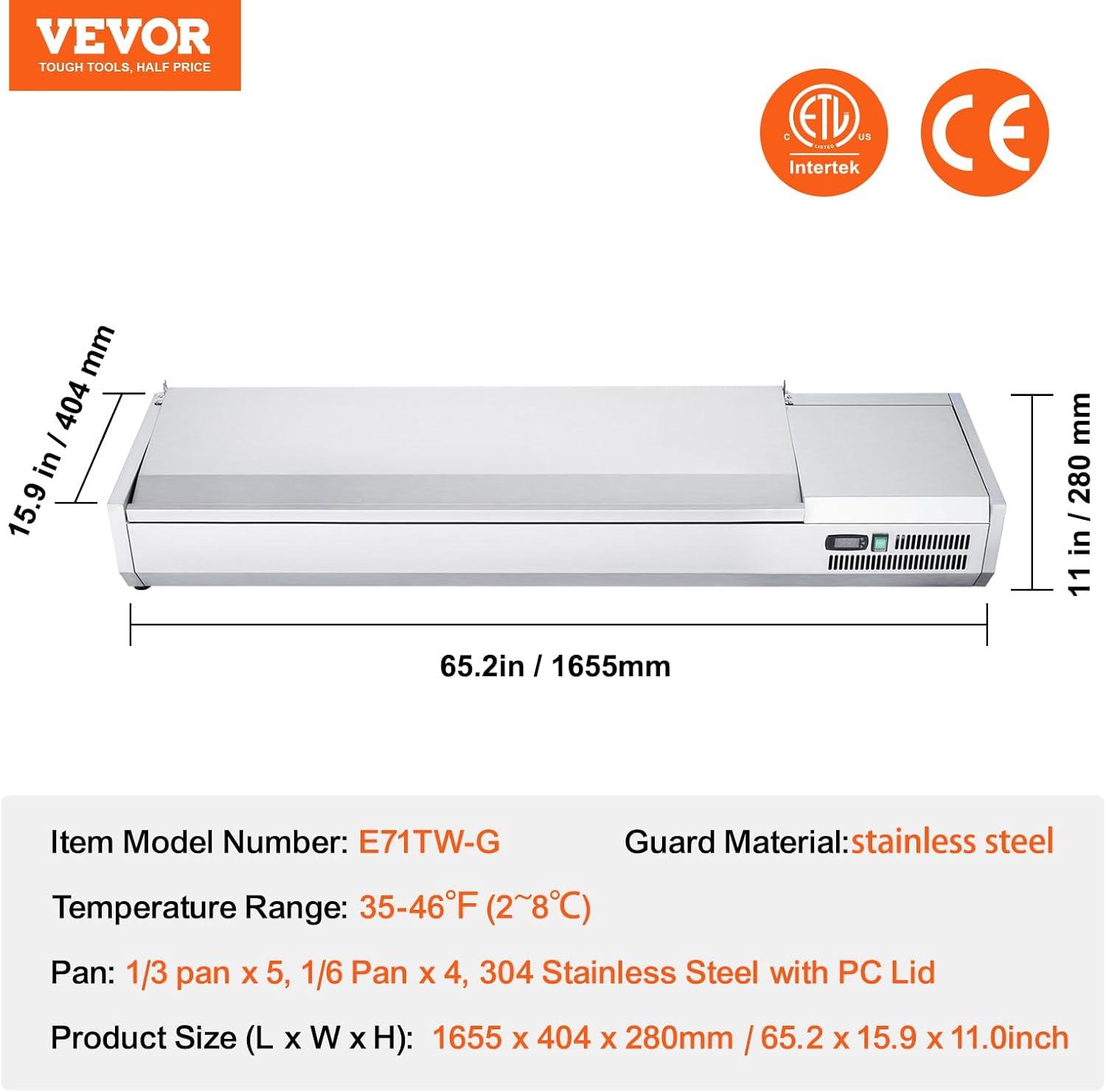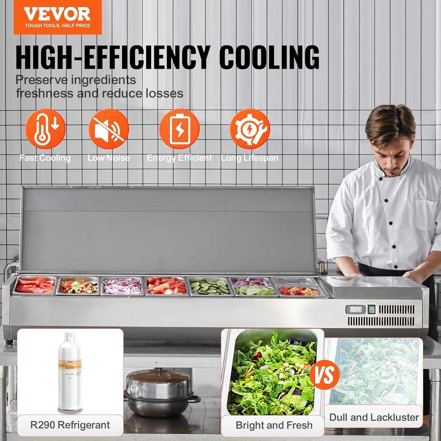Durable and Easy to Maintain: CE/ETL certified for quality assurance, The refrigerated condiment prep station featuring a 201 stainless steel base and frame that resists corrosion and rust. It also provides extra space for tools/utensils, secure heat dissipation. Please note it should be used during business hours to maintain the low temperature and freshness of pre-cooled food, and not for continuous or extended storage.