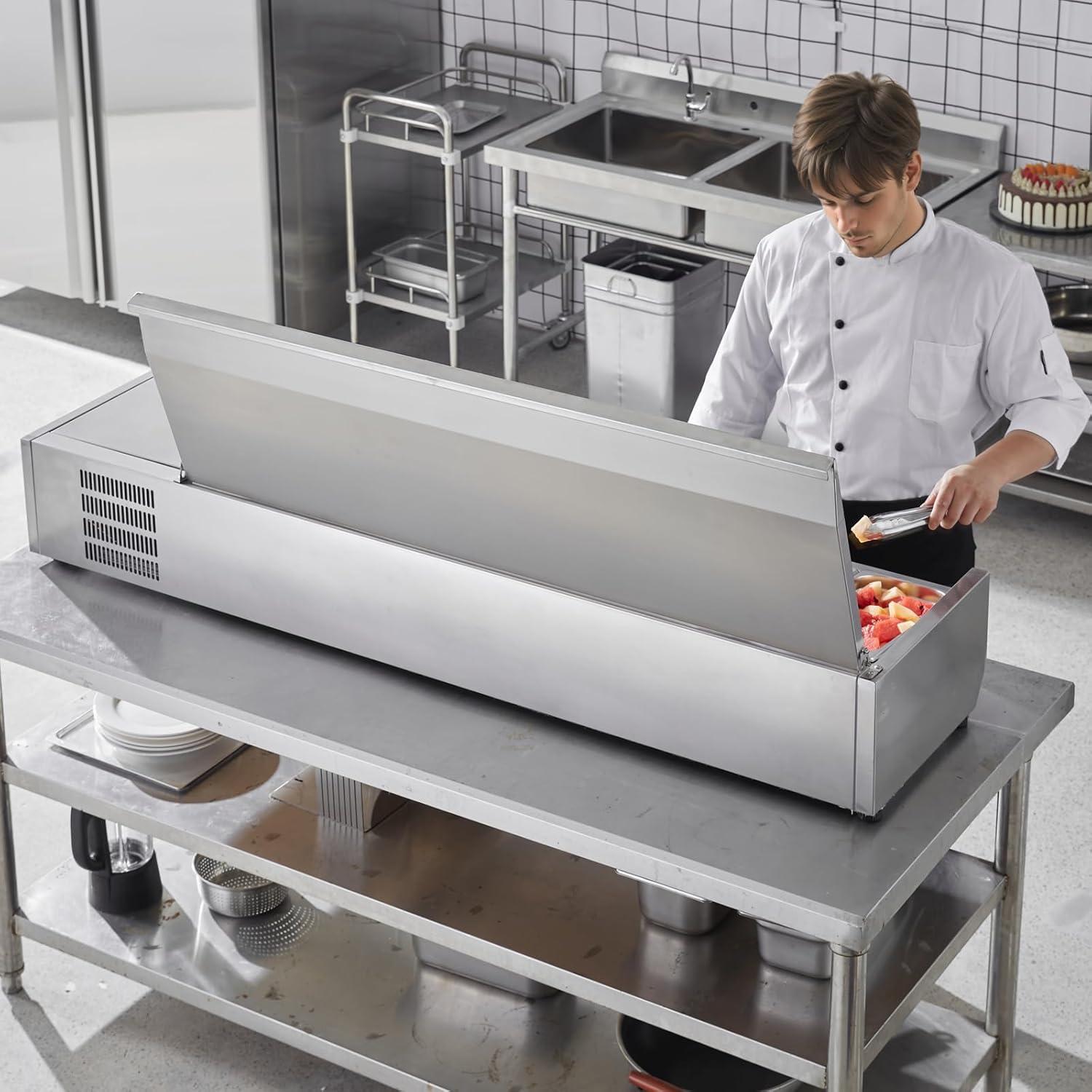 Stainless Steel Guard: Our refrigerated condiment station equipped with a removable stainless steel hinged lid for easy access, further preventing dust, dirt from entering, locking in the cold to keep food fresh and clean when not in use.