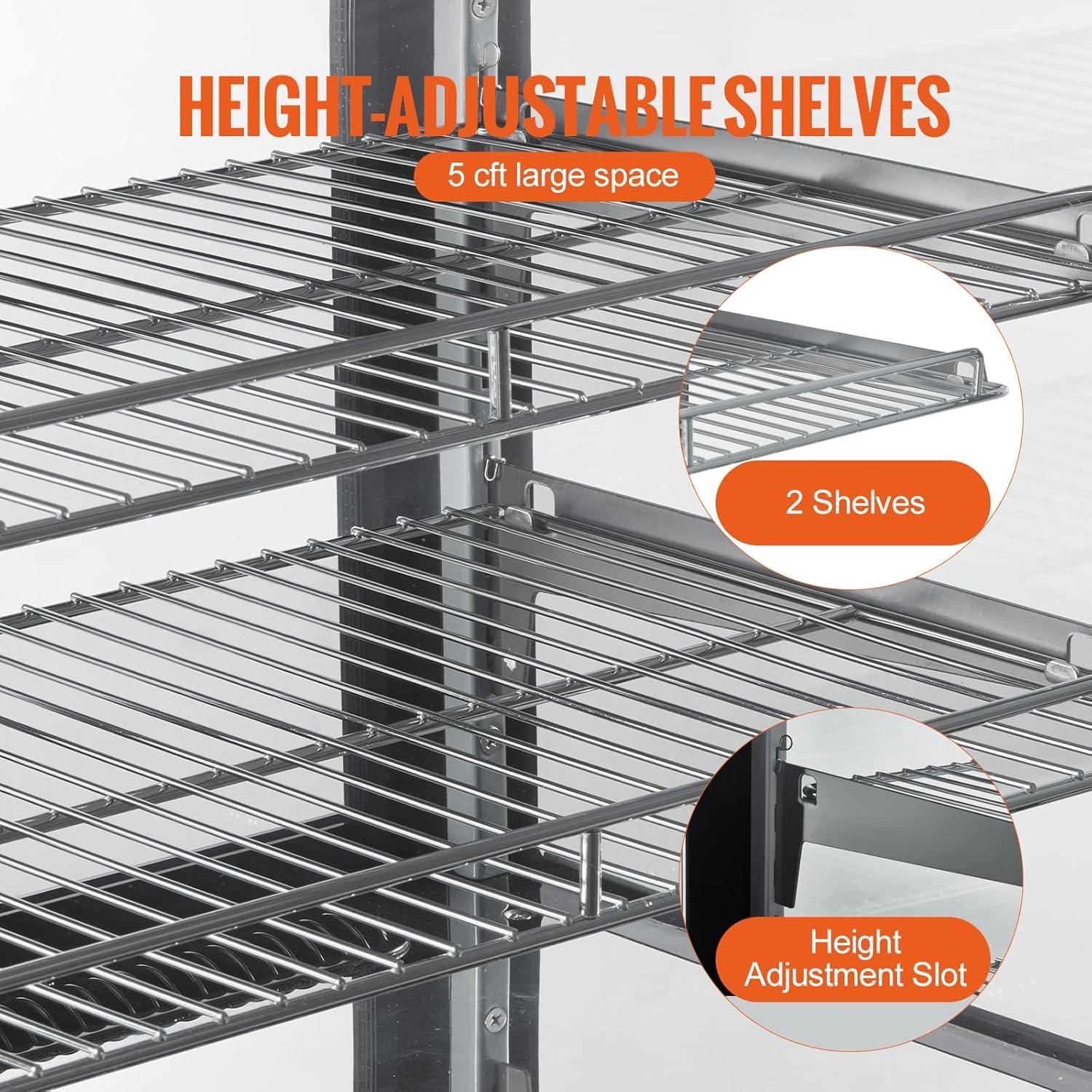 Flexible Storage Space: With a 5 cubic feet interior, the unit comes with 2 shelves and adjustable slots, allowing you to freely adjust the shelf height according to the size of your food, maximizing space utilization and perfectly showcasing your items.