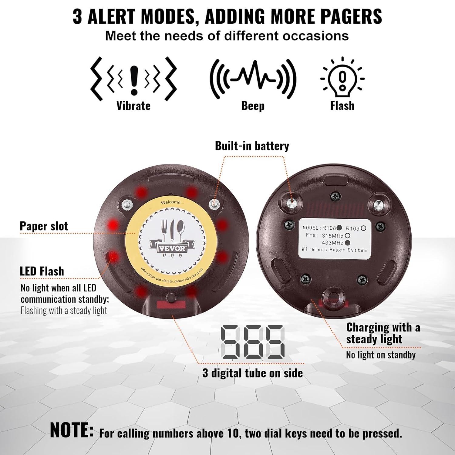 Three Alert Modes: The calling pager system offers LED, vibration motor, and buzzer modes, ensuring rapid identification and convenient customer alerting in noisy environments. It meets the demands of various scenarios and is widely used in restaurants, hotels, hospitals, and cafes.