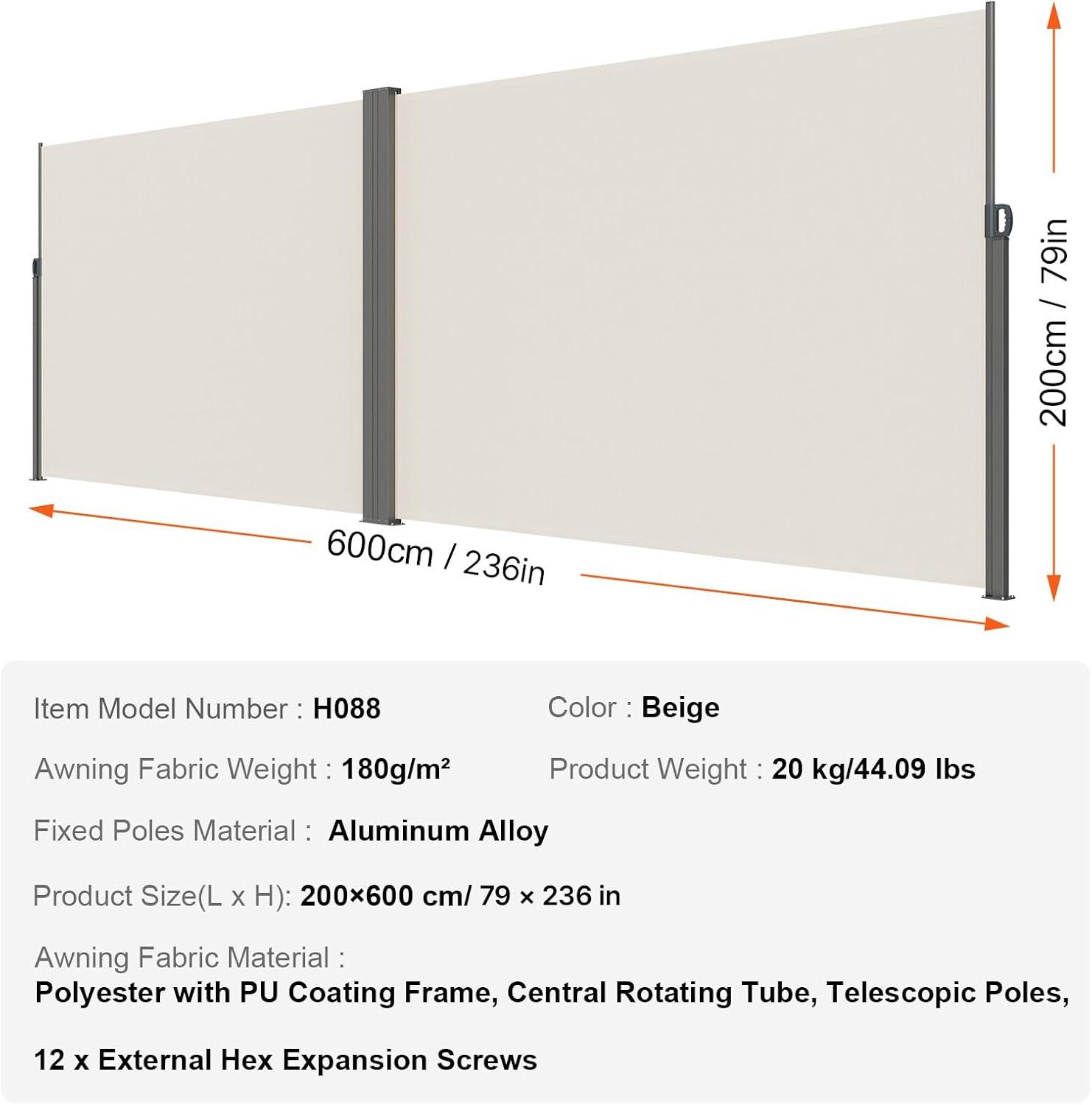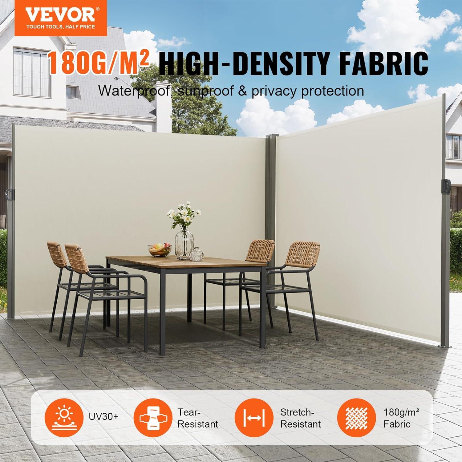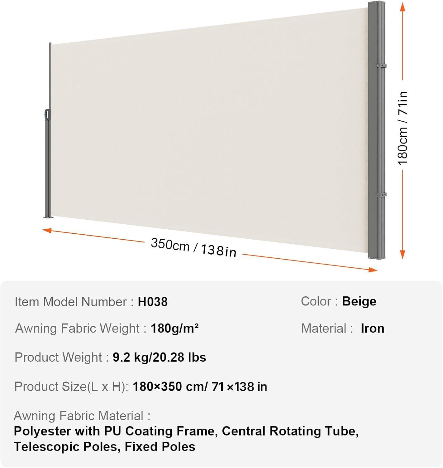 High-Quality Material: Our retractable side awning is made from 180g/m² high-density polyester fabric with a PU coating, providing excellent waterproof performance and tensile strength. It effectively blocks wind and rain, resists UV rays (UV30+), extends its lifespan, and ensures stable shelter for outdoor activities.