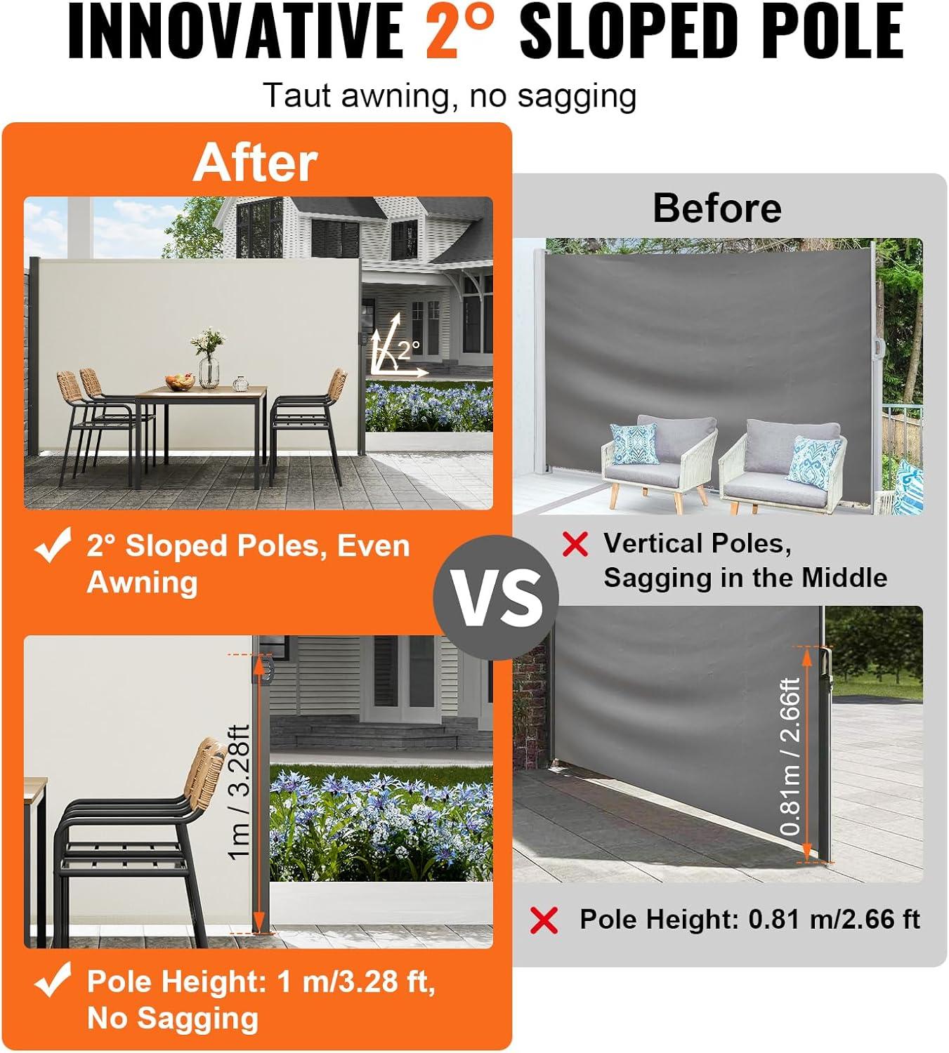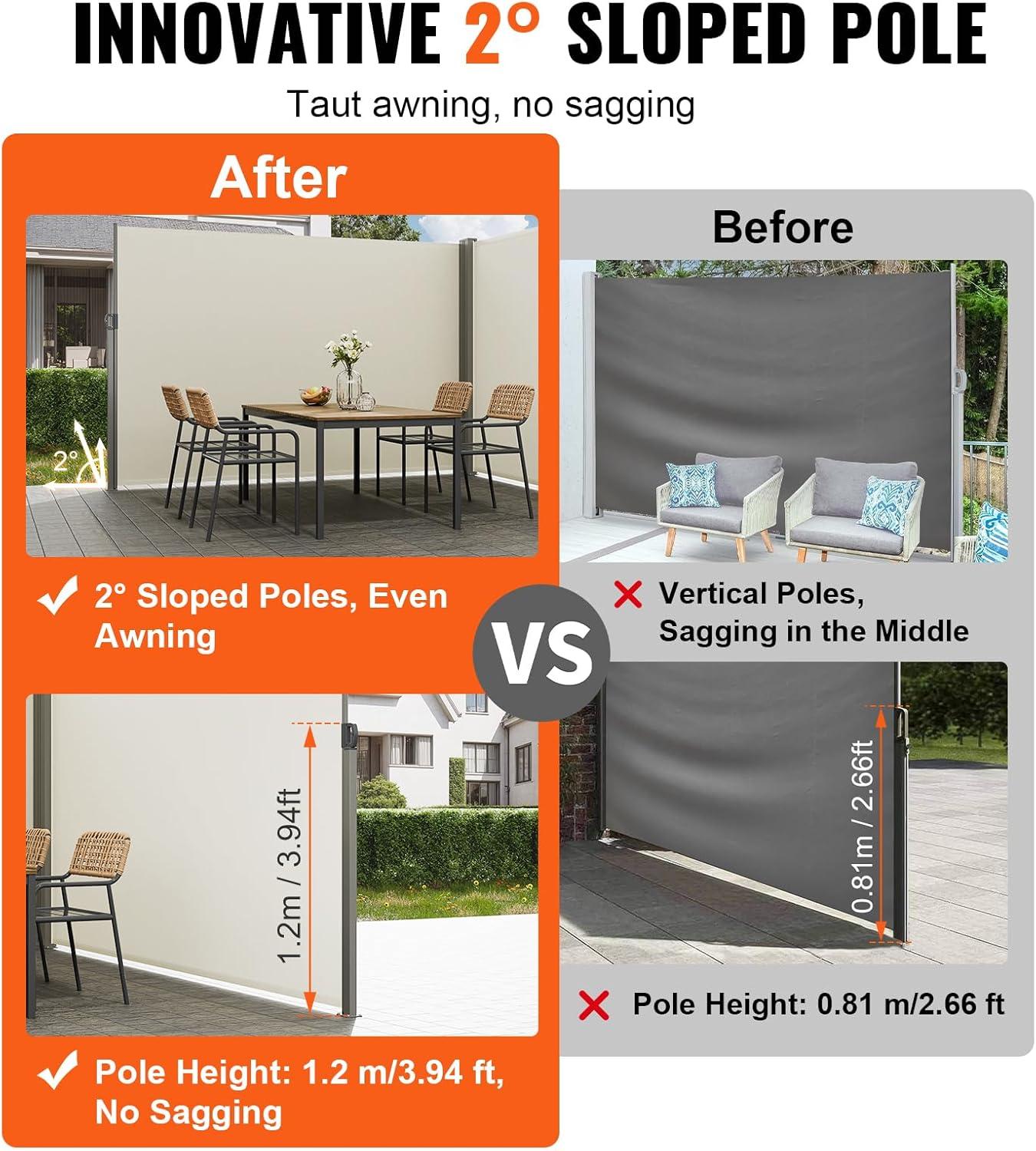 Sturdy and Durable Structure: Innovative design includes a 2° tilt on the support poles for added height and to prevent fabric sagging. The frame poles are made from high-strength iron material with a powder coating, ensuring a stylish appearance and corrosion resistance but also providing high strength and stability.