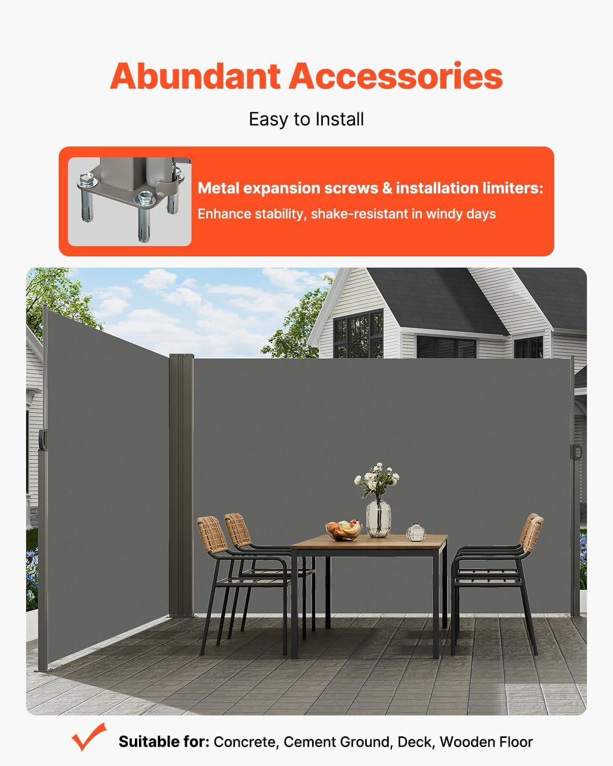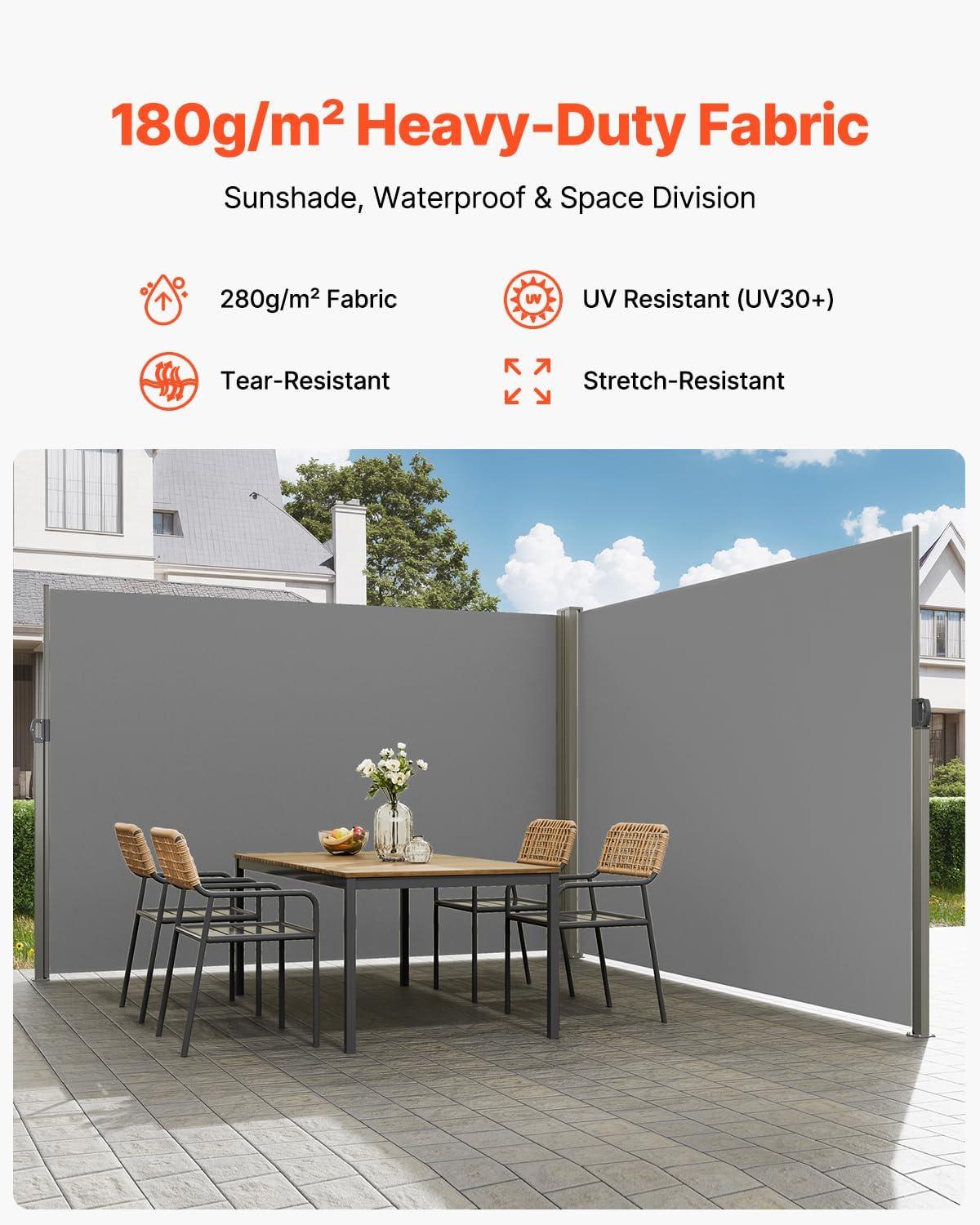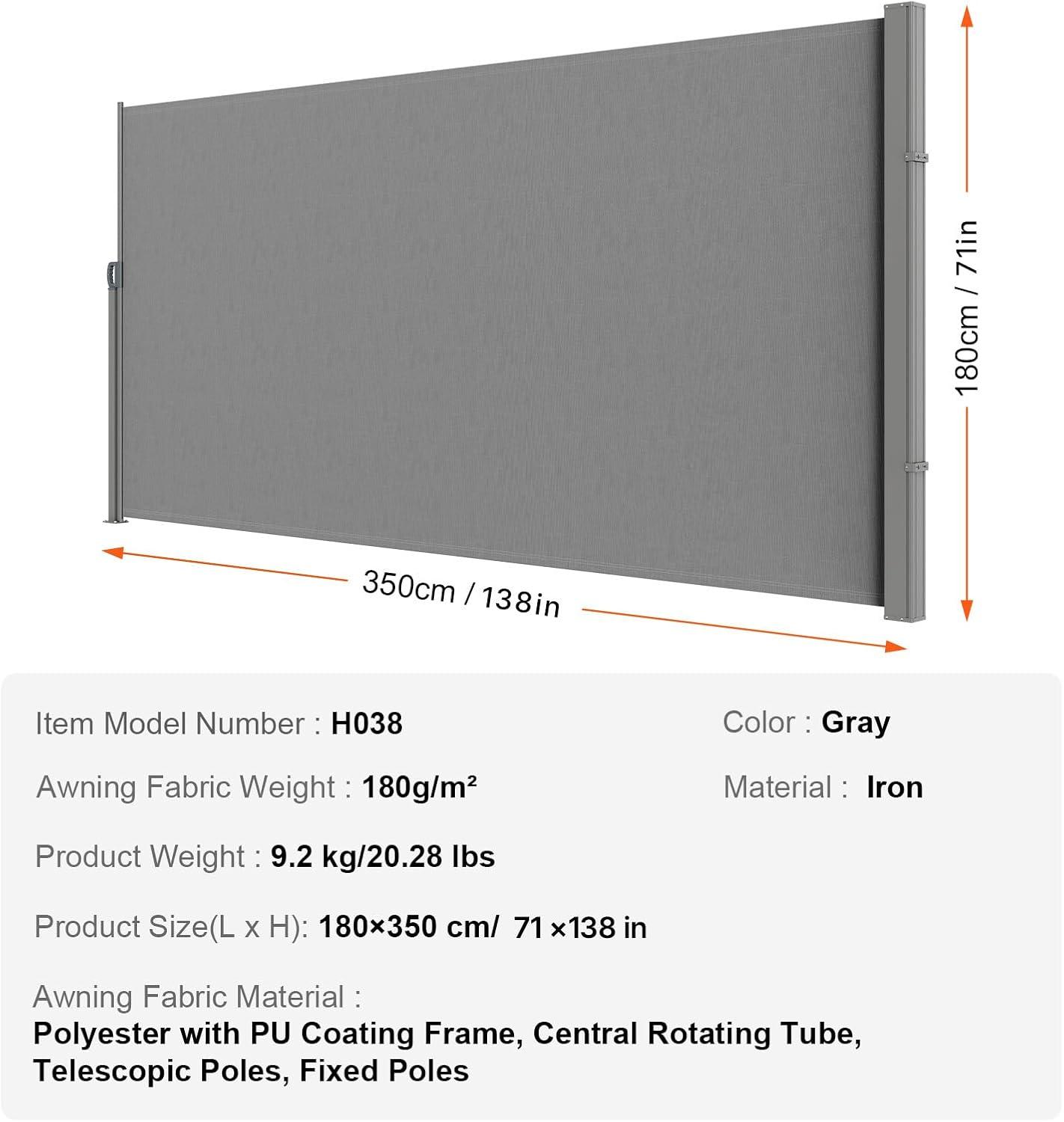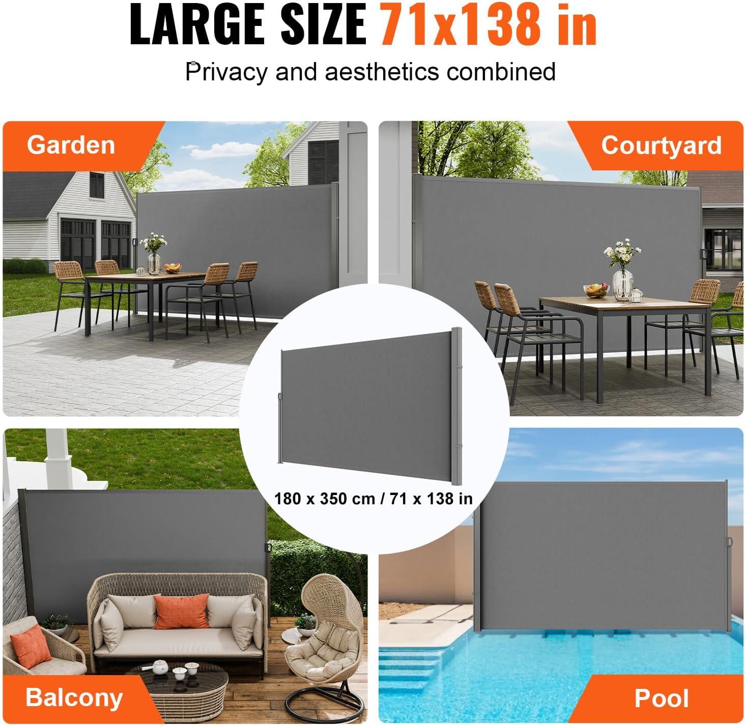 VEVOR Retractable Side Awning, 71''x 138'' Outdoor Privacy Screen, 180g Polyester Water-Proof Retractable Patio Screen, UV 30+ Room Divider Wind Screen for Patio, Backyard, Balcony, Gray(Gray)