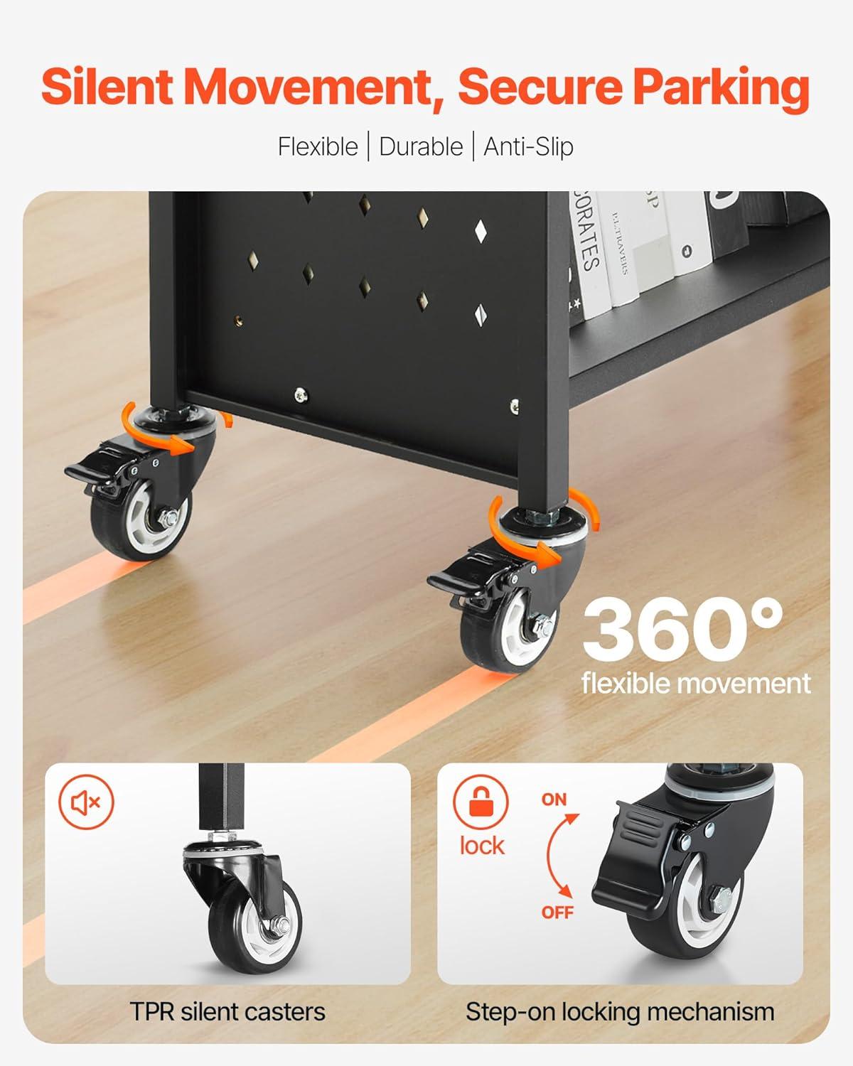 Silent Movement: TPR silent swivel casters glide smoothly, and two have a locking feature for secure positioning. Move the book truck effortlessly across wood or tile floors without disturbing anyone—great for libraries or nighttime use