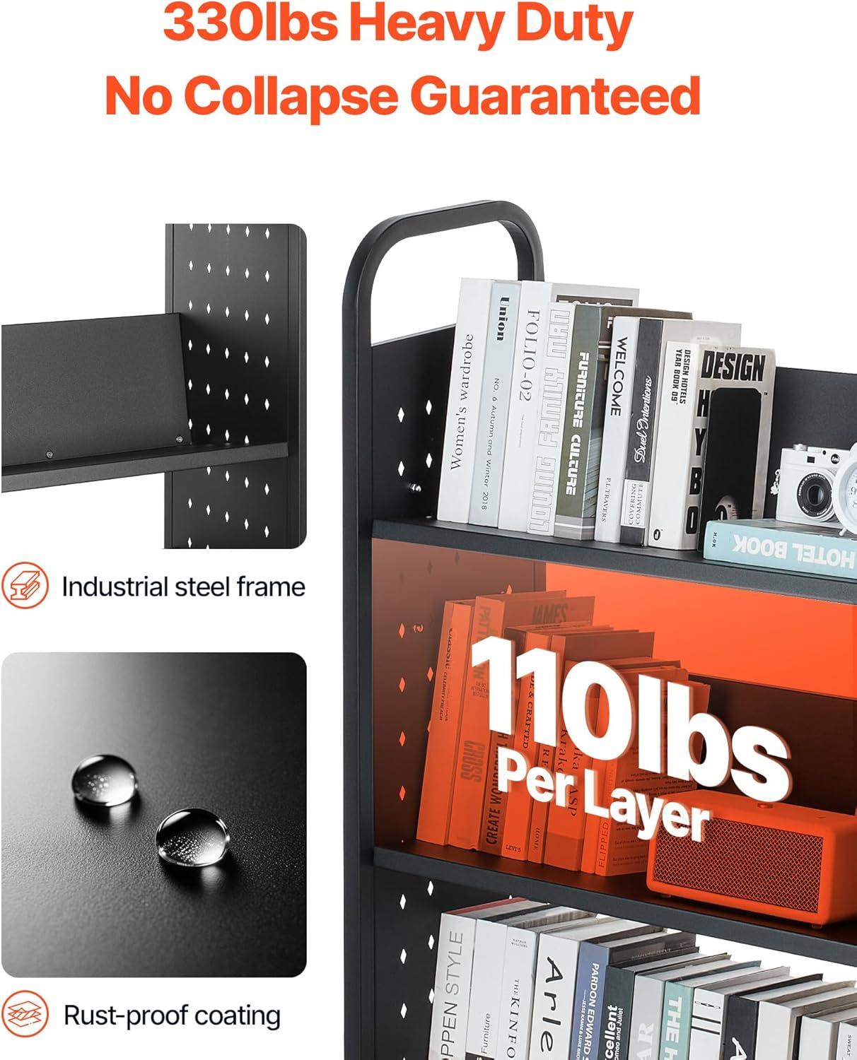 Stable Load-bearing: Made of high-strength carbon steel, each layer of the rolling book cart supports 110 lbs (50 kg), with a total capacity of 330 lbs (150 kg). The rust-resistant coating ensures durability, ideal for heavy books or equipment