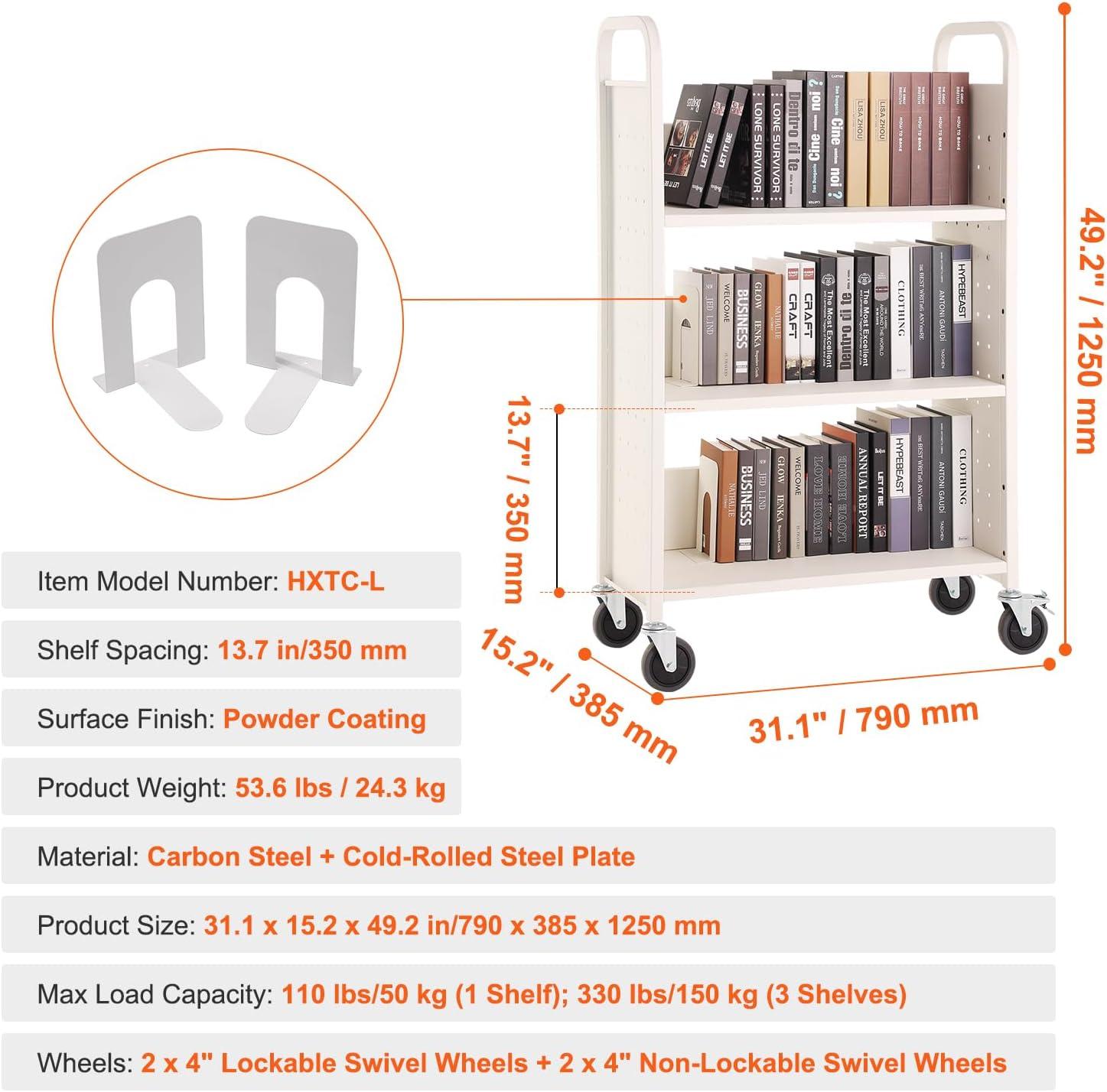 VEVOR Rolling Library Book Cart, 330 lbs Capacity, 30.3 x 15 x 48.0-Inch Library Cart, Single Sided V-Shaped Shelves with 3-Inch Lockable Wheels, Book Truck for Home Shelves Office and School, Black(White)