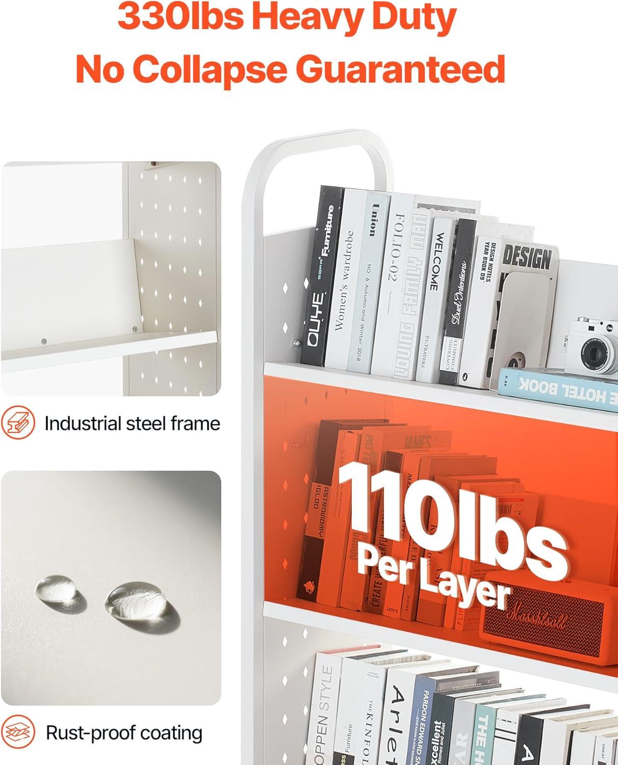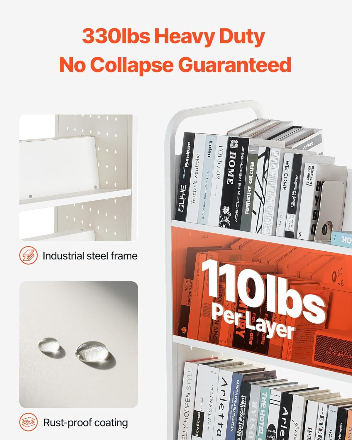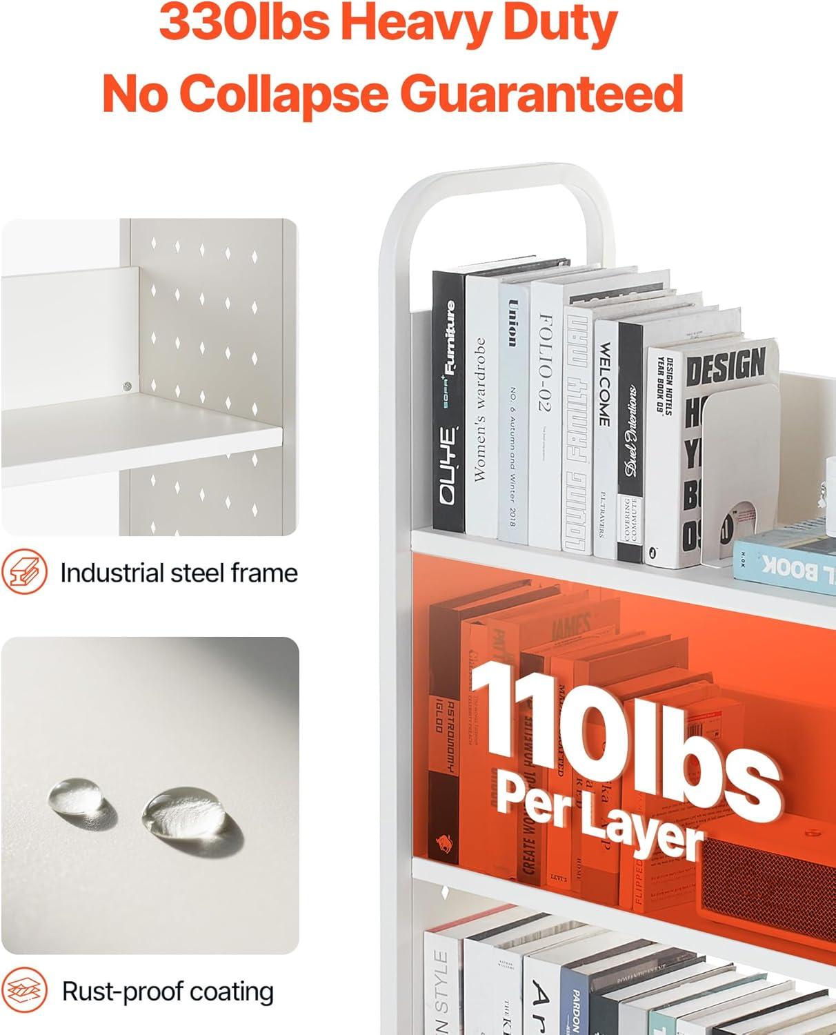 Stable Load-bearing: Made of high-strength carbon steel, each layer of the rolling book cart supports 110 lbs (50 kg), with a total capacity of 330 lbs (150 kg). The rust-resistant coating ensures durability, ideal for heavy books or equipment