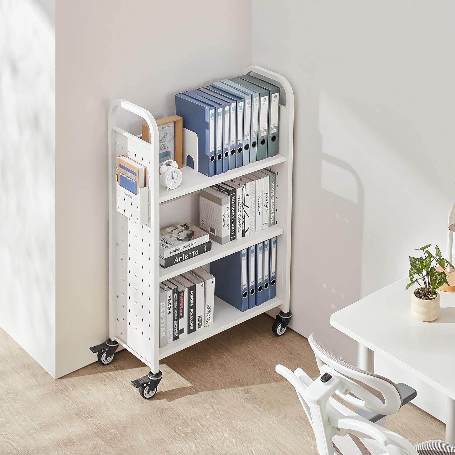 Extra Large Capacity: This 3-tier book cart with 14.17-inch high shelves holds a ton of books or office supplies! It’s also equipped with side compartments for A4 folders/tablets—ideal for libraries, home use, and more