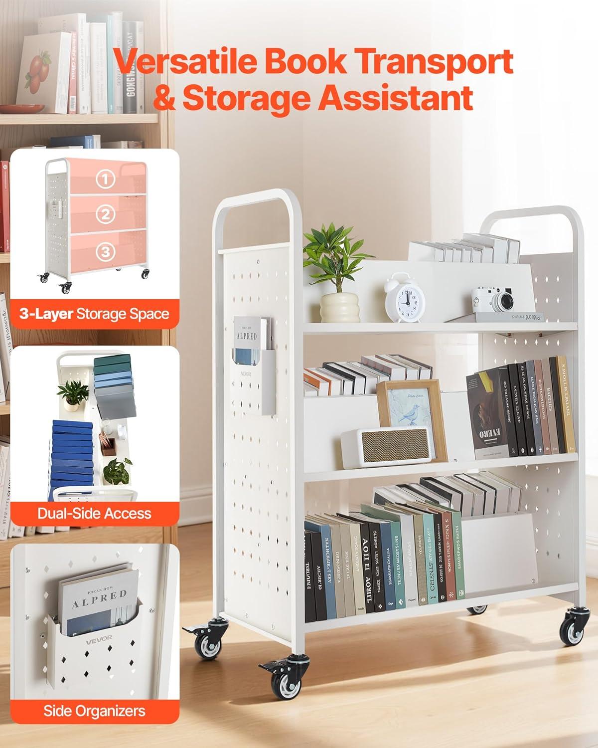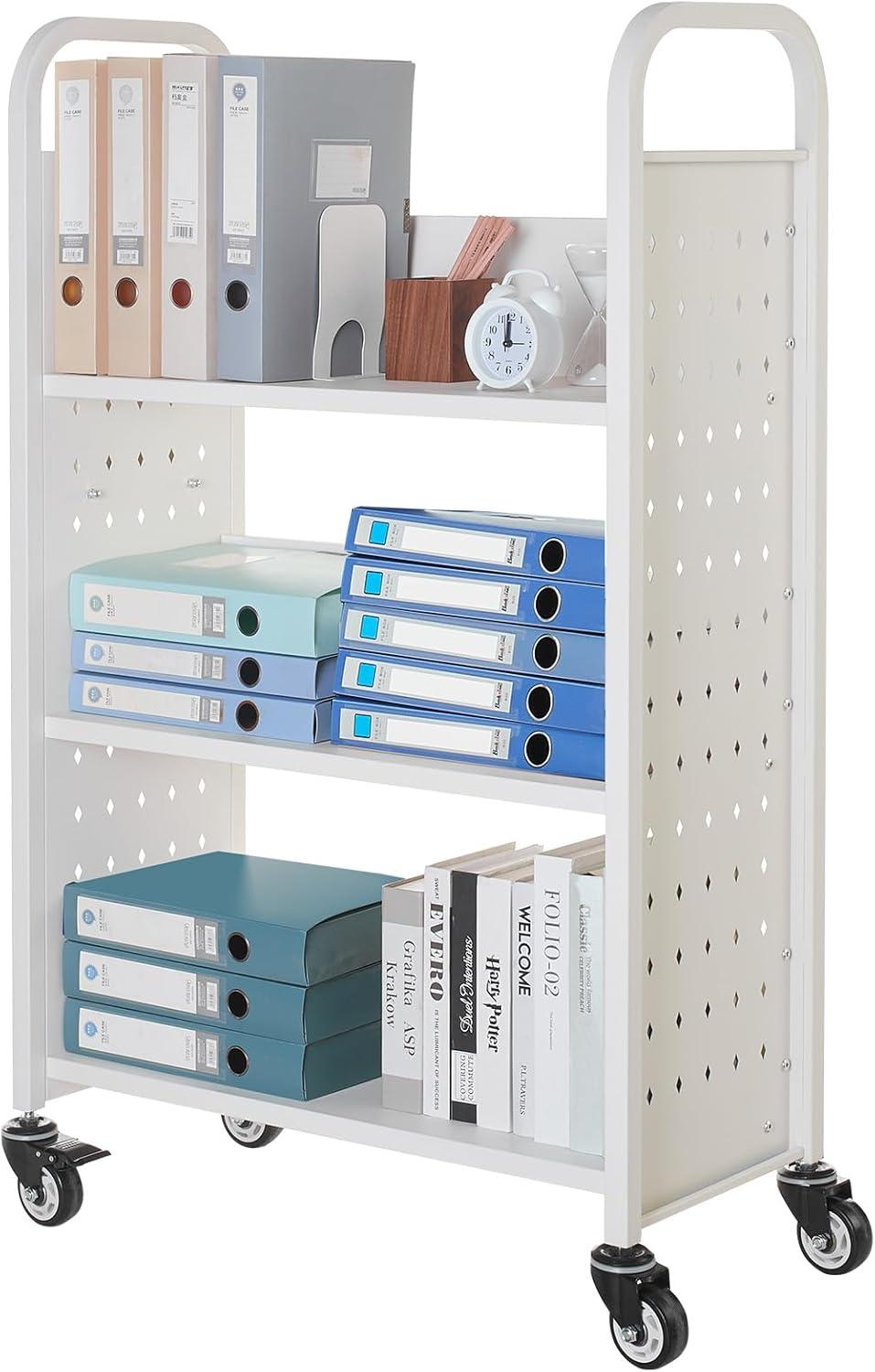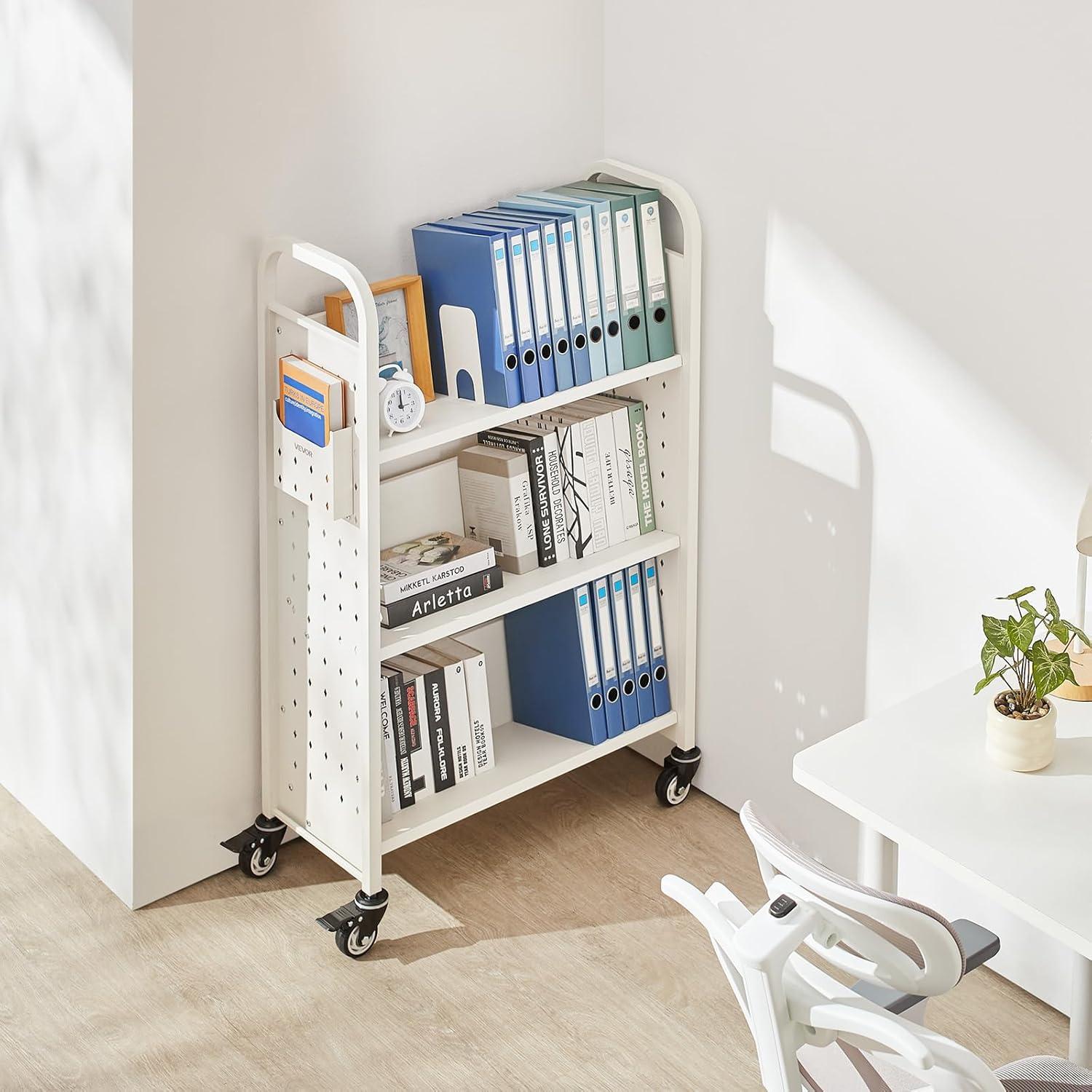 VEVOR Rolling Library Book Cart, 330 lbs Capacity, 30.3 x 15 x 48.0-Inch Library Cart, Single Sided V-Shaped Shelves with 3-Inch Lockable Wheels, Book Truck for Home Shelves Office and School, Black(White)