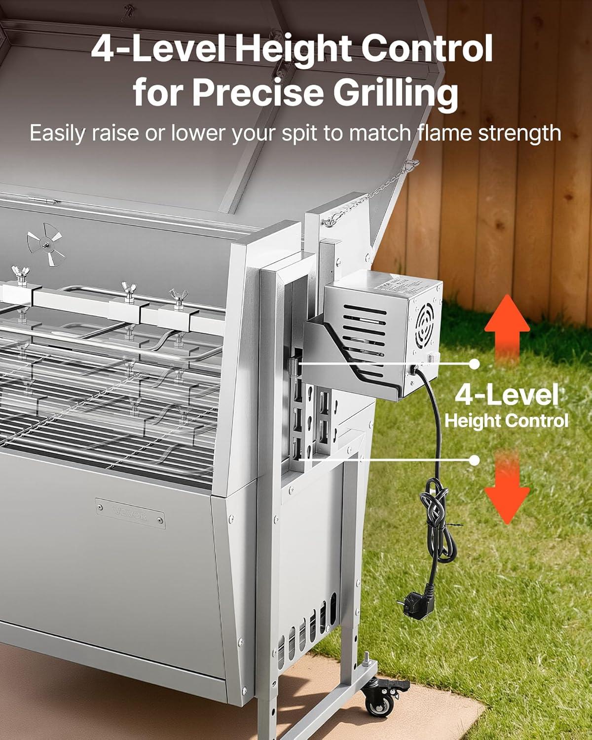 Flexible Heat Control: Easily adjust the rotisserie grill with 4 height levels for optimal heat control. Lockable wheels simplify movement, and accessories like spice holders, tongs, and brushes let you enjoy grilling straight from the box