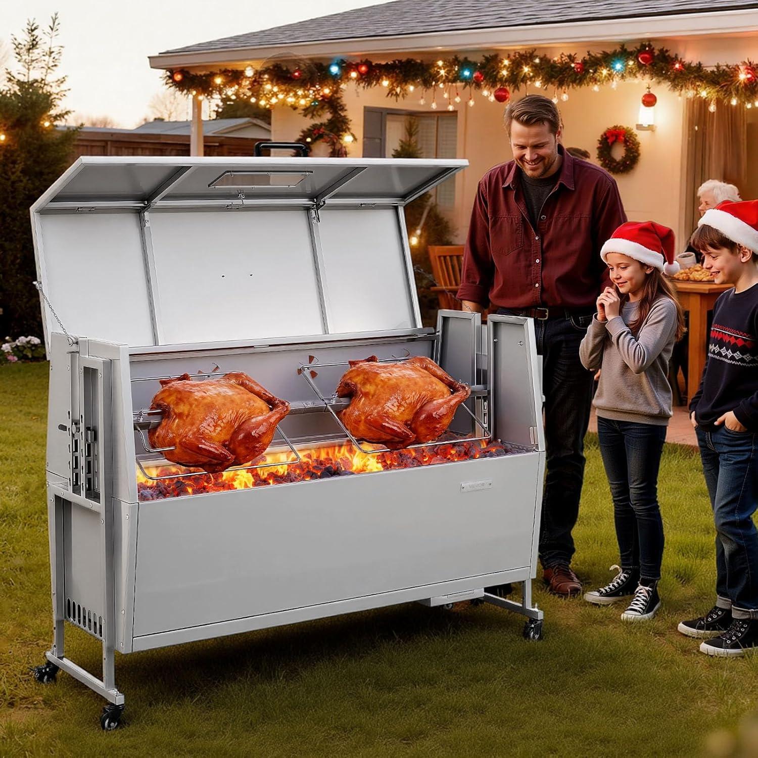 Heavy-Duty Capacity: Designed to handle up to 132 lbs/60 kg, this rotisserie grill's 56-inch/1422.4 mm frame accommodates pigs, lambs, turkeys, and more. Ideal for creating large, evenly cooked meals that impress family and friends at any gathering