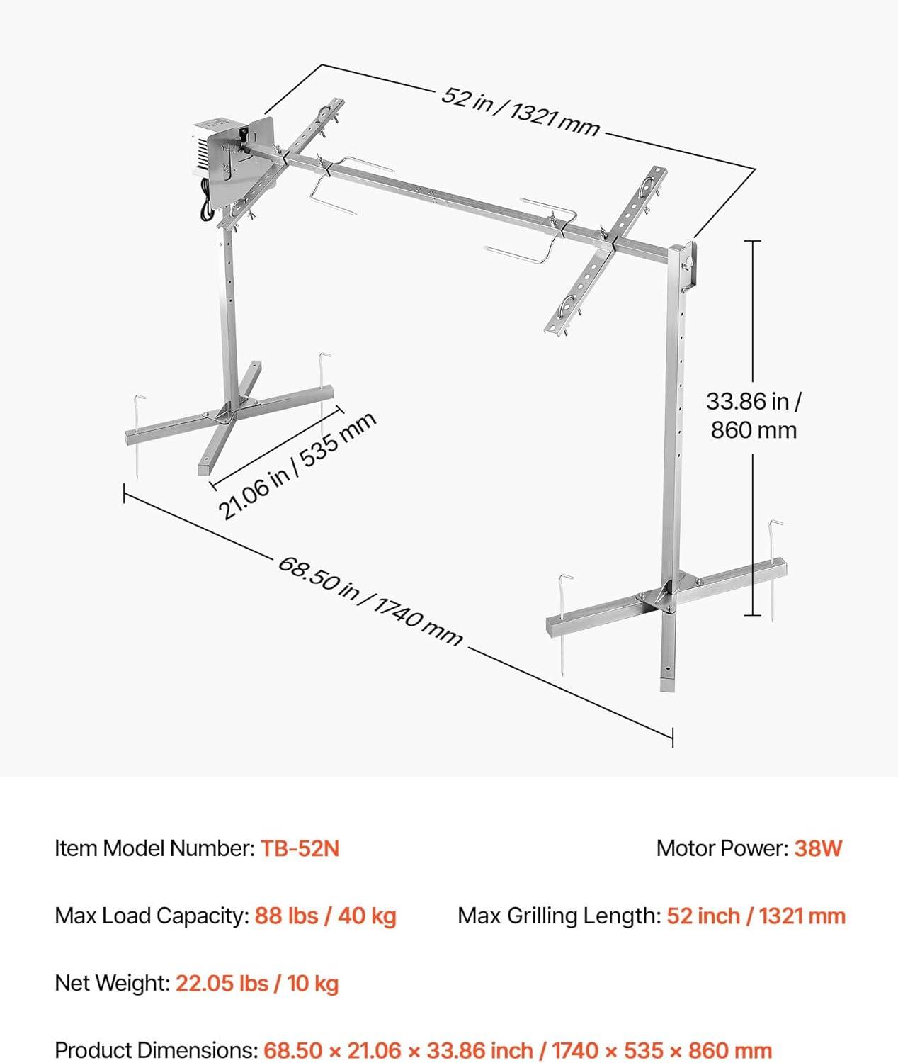 VEVOR Rotisserie Grill, 56in Electric Rotisserie Grill Kit 8 Level Height, BBQ Grills Rotisseries Kit with 132 lbs Load Capacity, Asador de Puerco, Stainless Steel Automatic Grilling Kits for Parties(52″/88 lbs)
