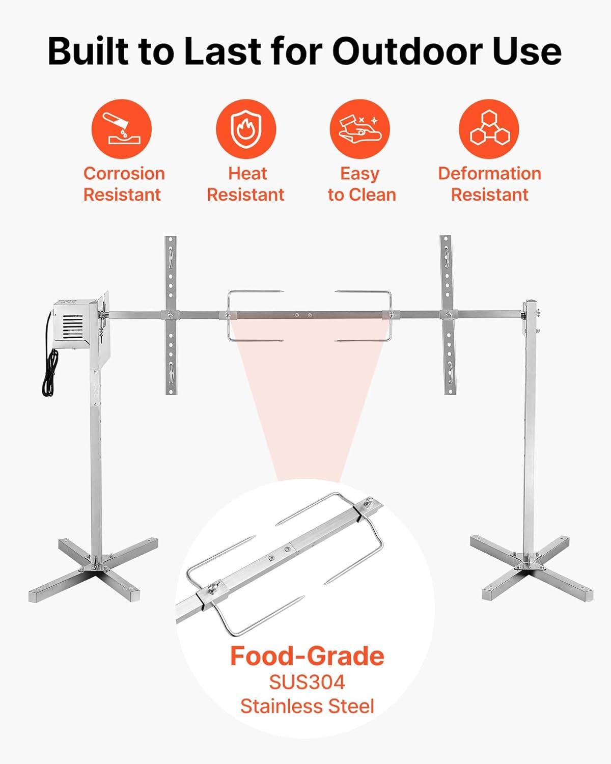 Stainless Steel Build: Crafted with sturdy stainless steel, this VEVOR rotisserie kit ensures rust resistance and effortless cleaning. Equipped with SUS304 forks for food contact, it handles heavy outdoor cooking with stability and efficiency