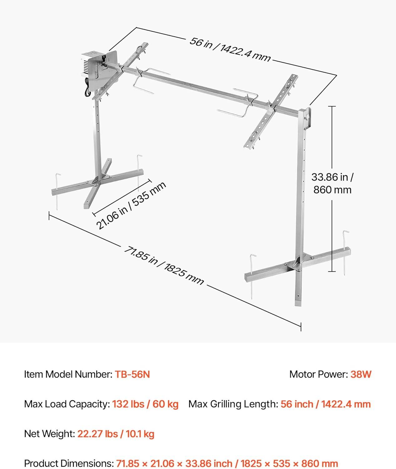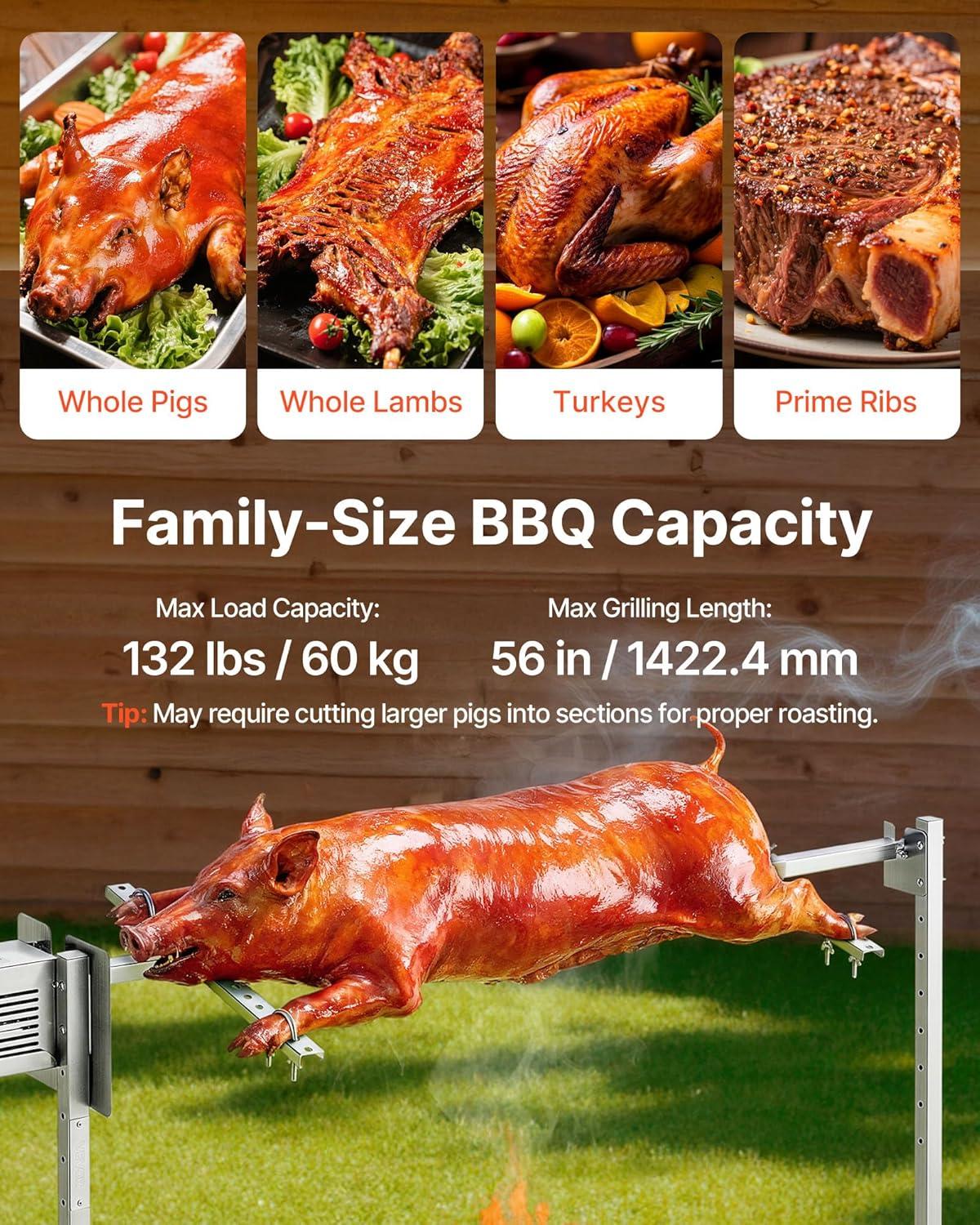 Heavy-Duty Capacity: Designed to handle up to 132 lbs/60 kg, this rotisserie grill's 56-inch/1422.4 mm frame accommodates pigs, lambs, turkeys, and more. Ideal for creating large, evenly cooked meals that impress family and friends at any gathering