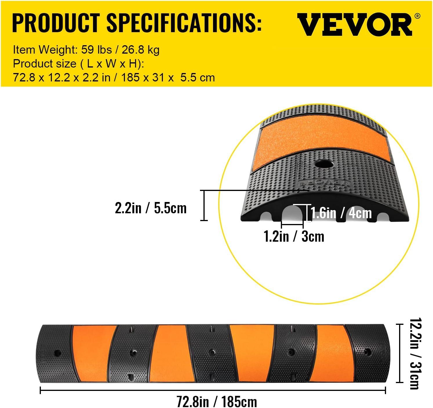 72.8″L 2-Channel Ramp: Amount: 2 PCs; Product size: 72.8″L x 12.2″W x 2.2″H/ 185 x 31 x 5.5 cm; Single channel size:1.2″W x 1.6″H/ 3 x 4 cm; 2 channels on the bottom for cable protection or drainage. The speed bump is ideal for creating a secure driving environment for roads, parking lots, and more.