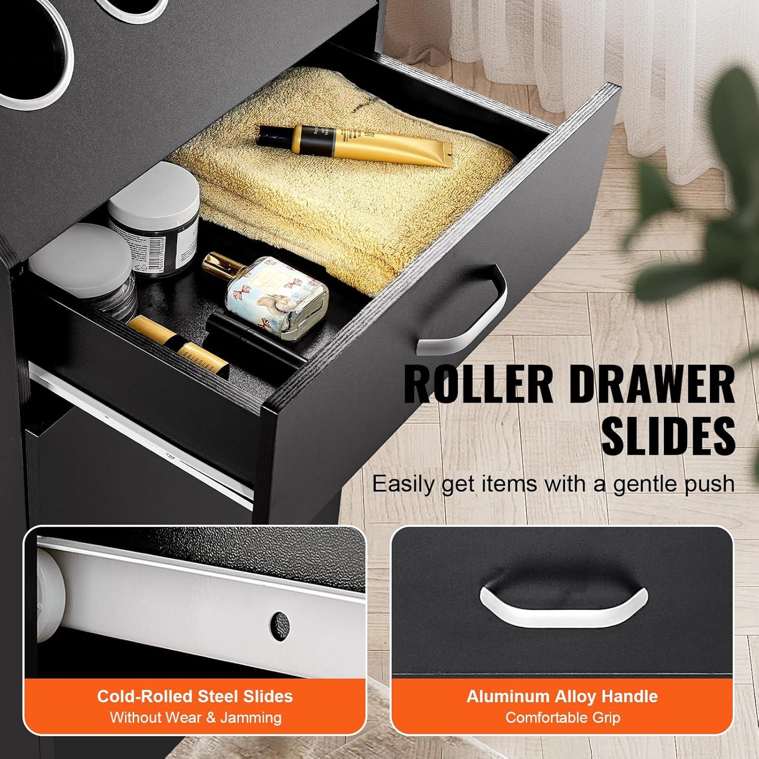 Durable Material: Constructed with a thickened MDF board and a matte black PVC double-decorative surface, our salon station for hair stylists is waterproof and easy to clean. Its versatile design complements various interior decor styles, enhancing aesthetics.