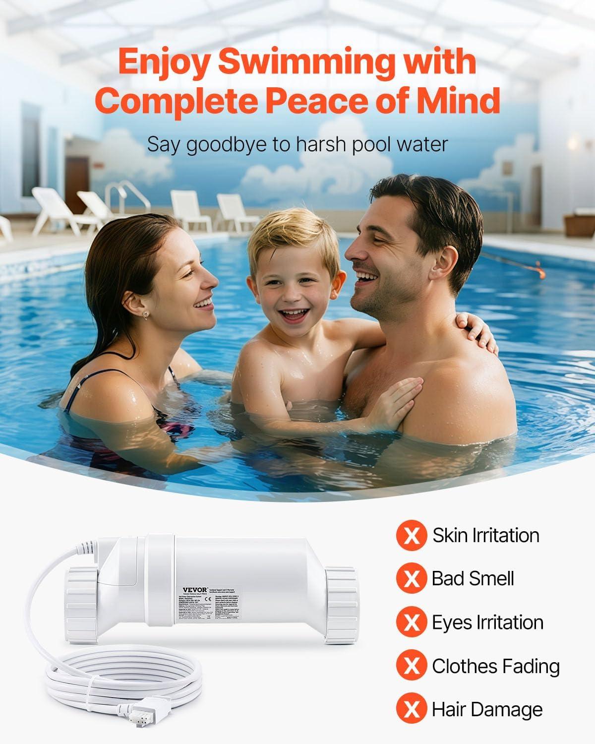 Easy Pool Water Maintenance: Using advanced electrolytic technology, the pool salt chlorination system generates chlorine from salt and titanium, eliminating the need for expensive chlorine tablets. Say goodbye to eye irritation and unpleasant odors from traditional chlorine pools, while enjoying a gentler swimming experience
