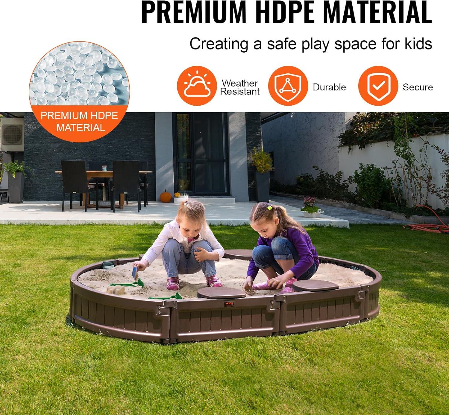 VEVOR Sandbox with Cover, 48.6''x48.6''x12.4'' Square Sand Box, HDPE Sand Pit with 4 Corner Seats & Bottom Liner, Gift for Ages 3-12 Years Old Backyard Garden Easy Assembly, Brown, Brown(Oval)