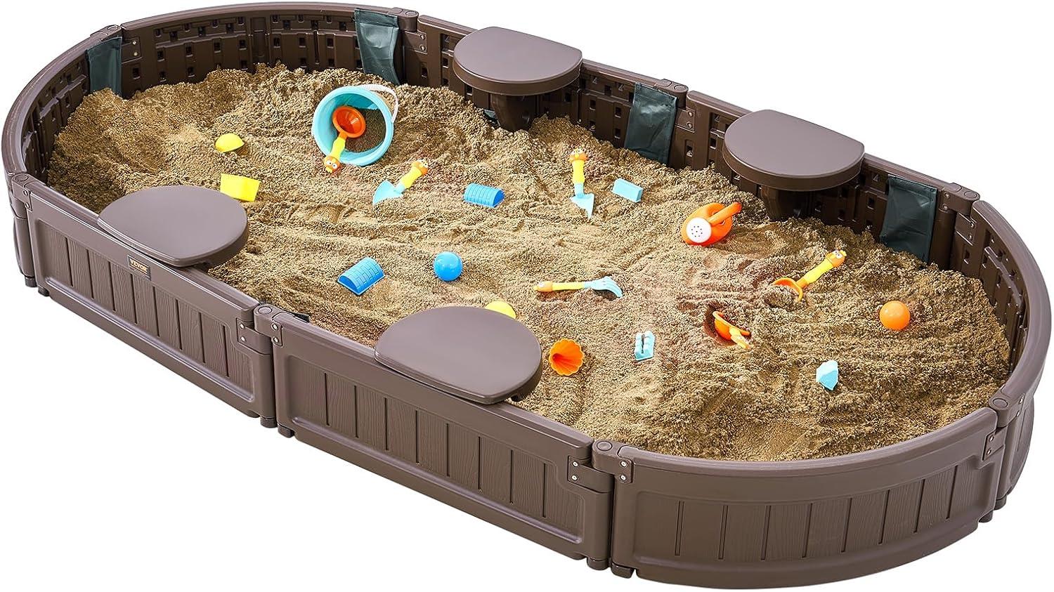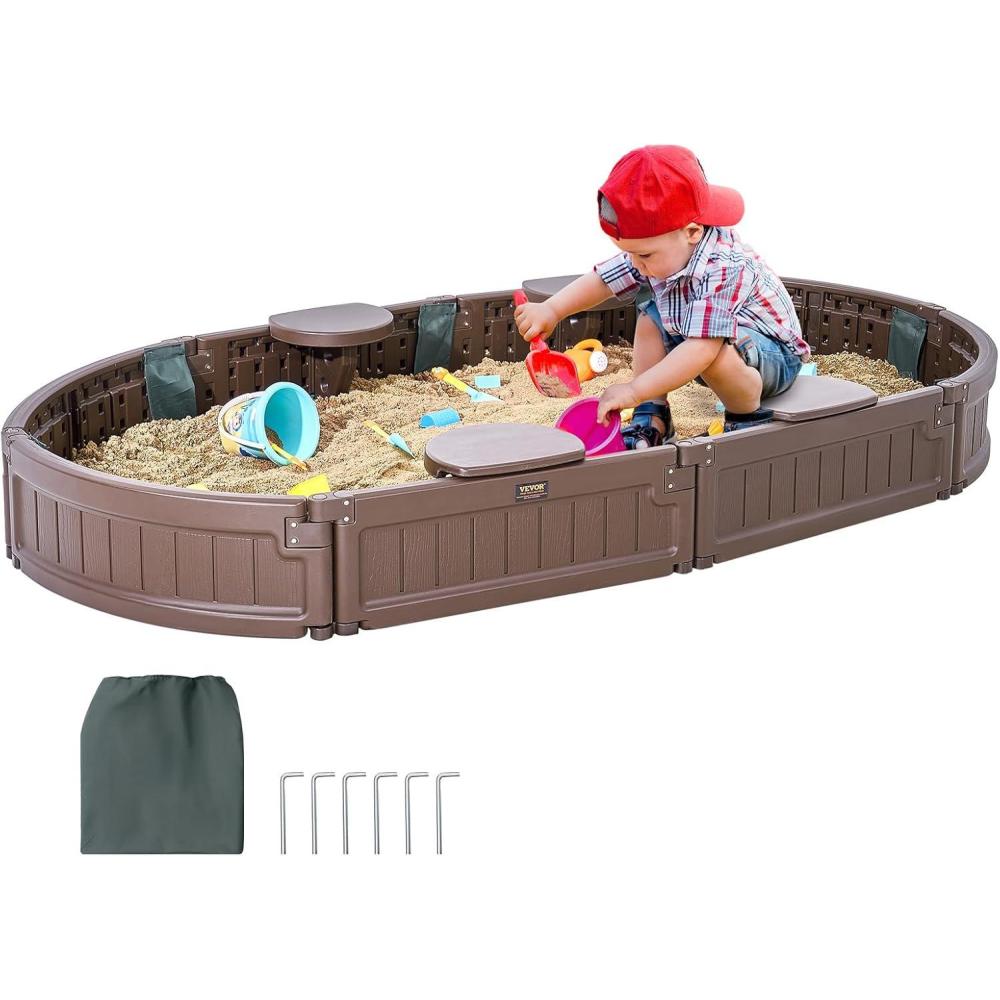 VEVOR Sandbox with Cover, 48.6”x48.6”x12.4” Square Sand Box, HDPE Sand Pit with 4 Corner Seats & Bottom Liner, Gift for Ages 3-12 Years Old Backyard Garden Easy Assembly, Brown, Brown(Oval)