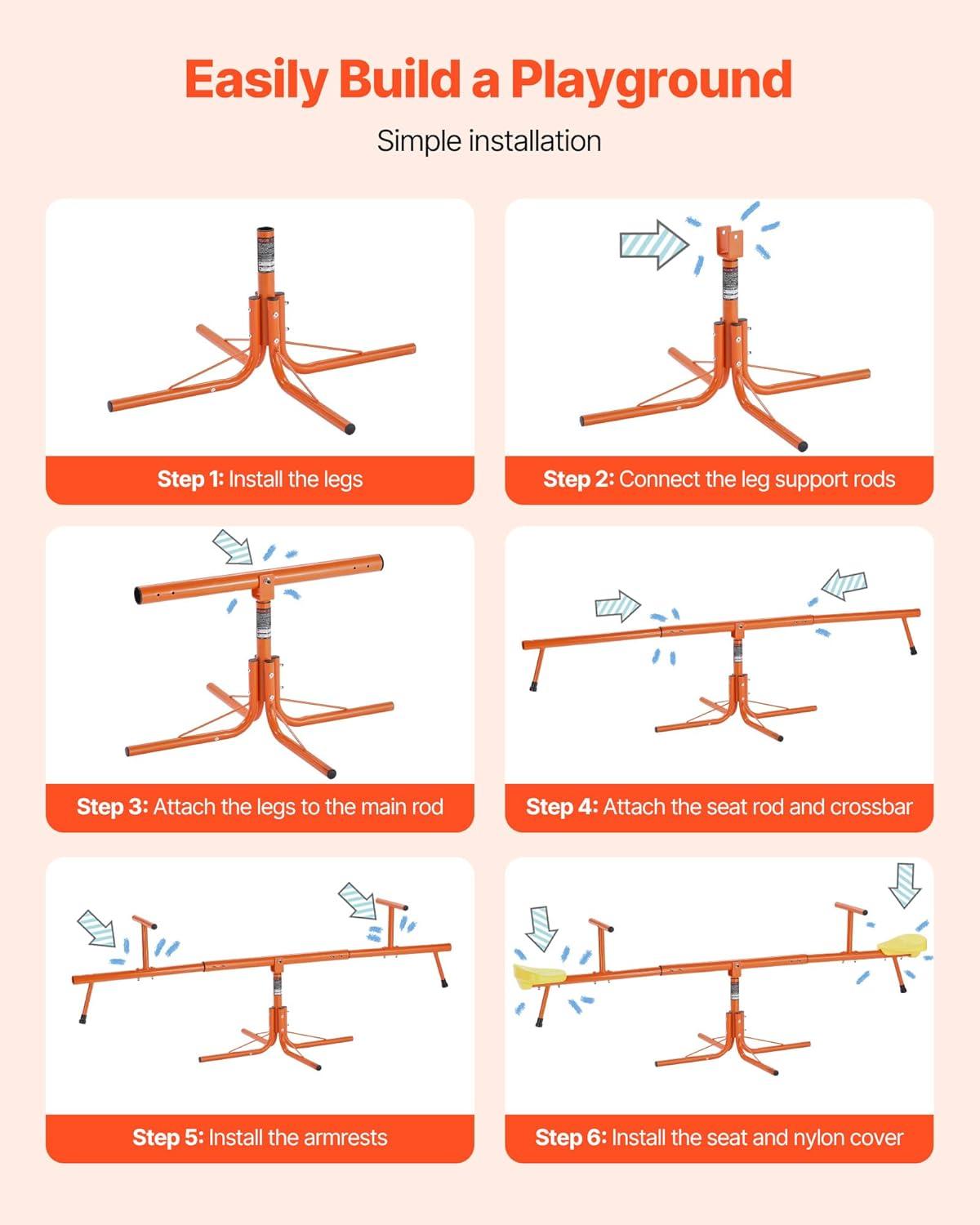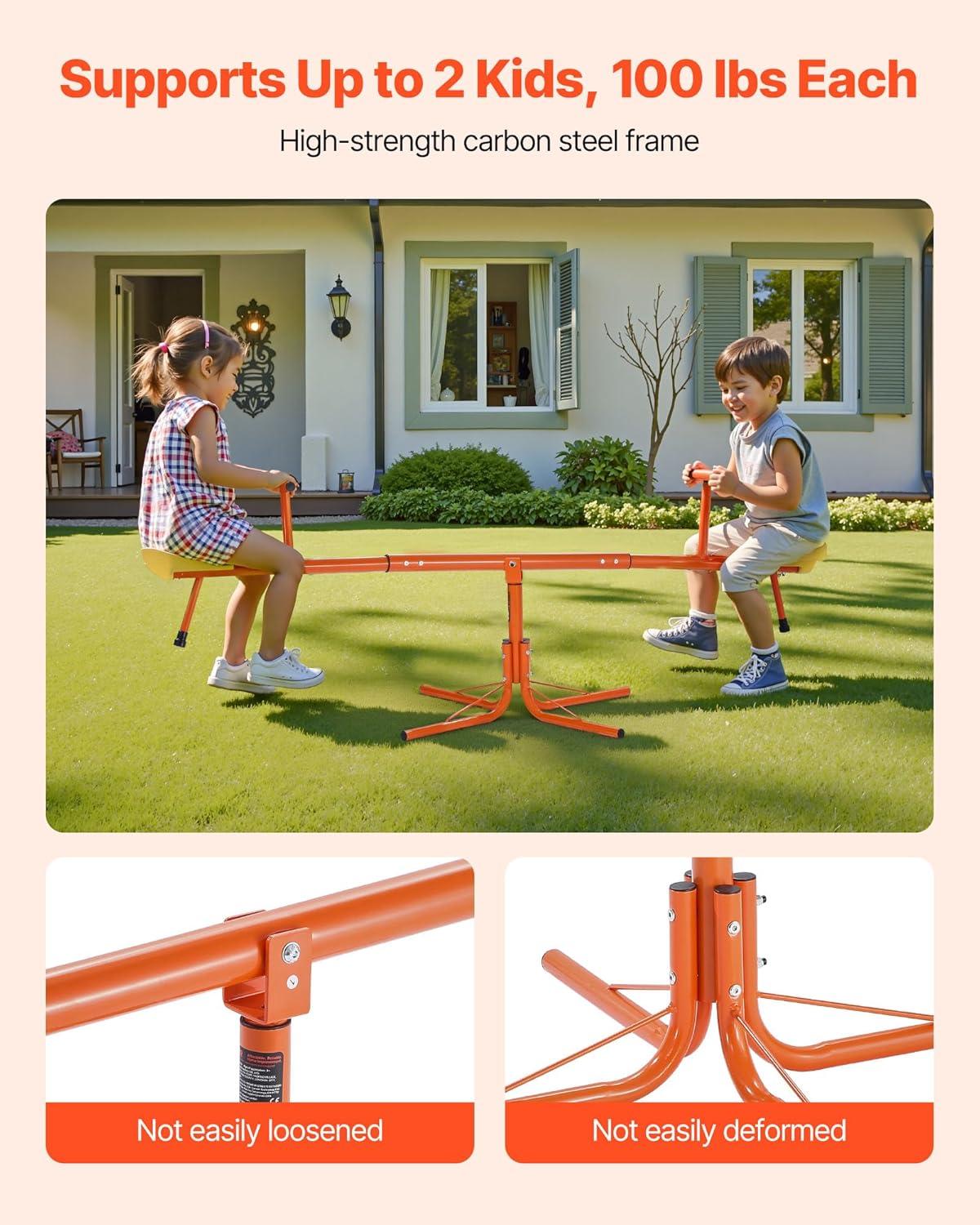 [Durable & Weather-resistant]: VEVOR seesaw teeter totter made from carbon steel with a powder coating, VEVOR kids seesaw supports up to 100 lbs / 45.4 kg per seat. It's waterproof and rust-resistant, ensuring durability for years of play, rain or shine
