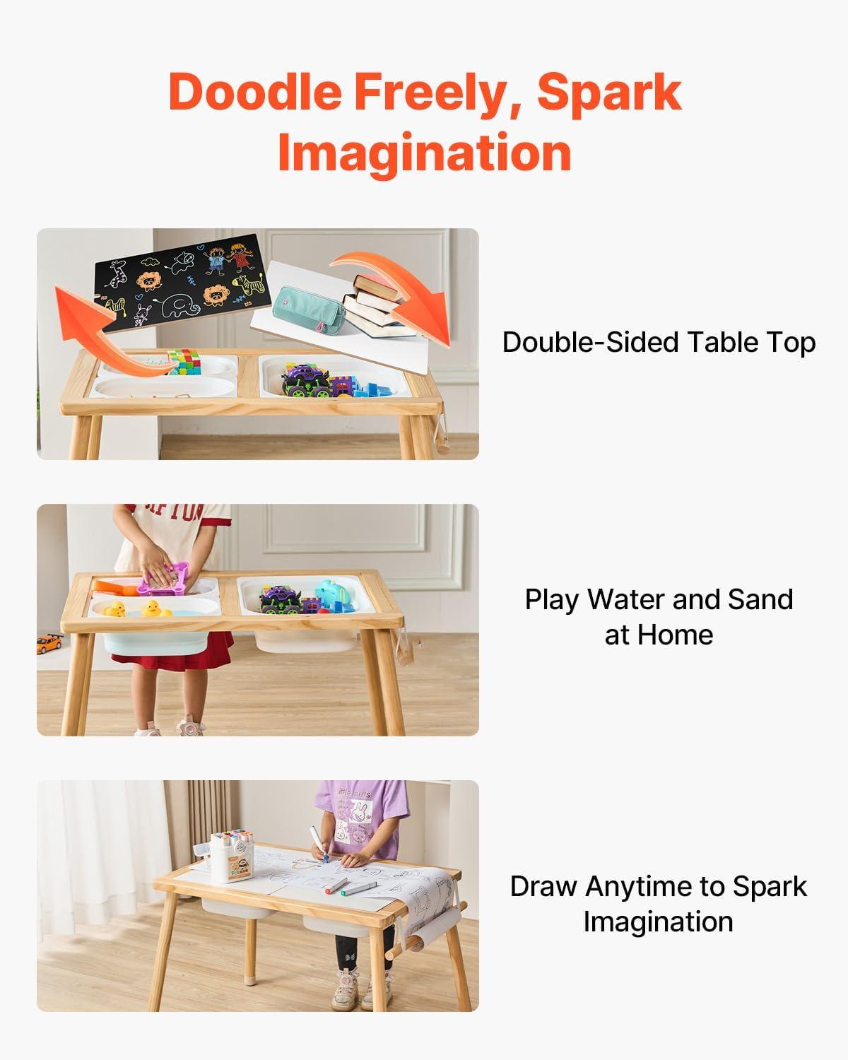 Easy to Assemble & Maintain: Attach the legs and 4 non-slip foot pads for quick setup. The pads protect floors and avoid tipping. The smooth tabletop wipes clean easily, letting children draw, doodle, and create freely on this toddler sensory table