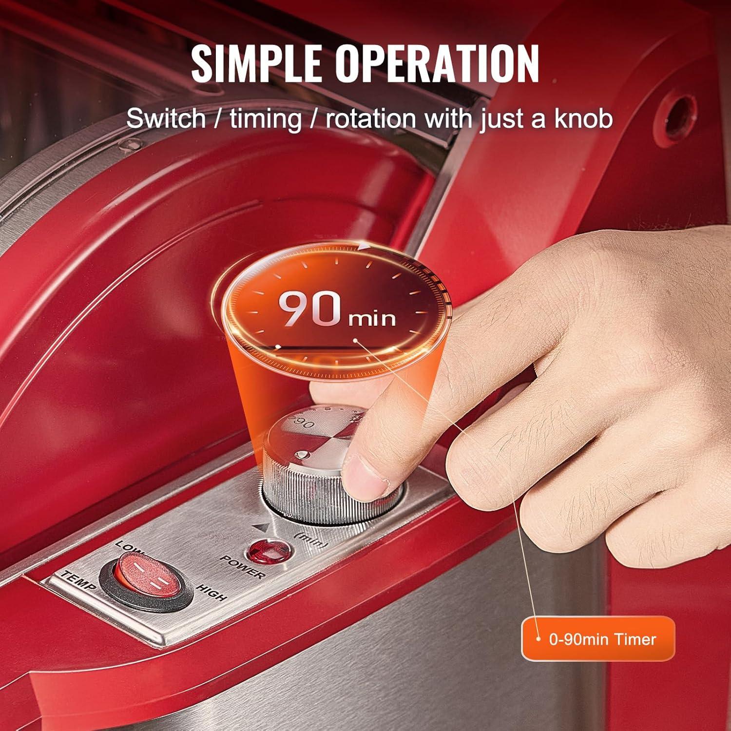 User-Friendly Operation: The timer knob ranges from 0 to 60 minutes, allowing for precise timing. Additionally, there is a temperature control knob and a rotation button. Simply skewer your meat, place it in the machine, set and start the knobs, and then wait for the delicious grilled results. The temperature display shows the current temperature inside the unit.