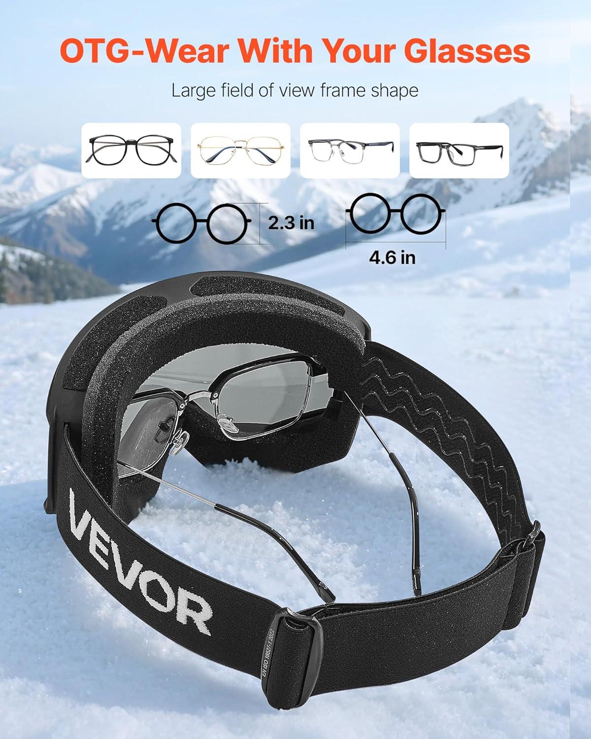 OTG Frame Design: The wide-frame snow goggles fit most glasses up to 4.6 x 2.3 in without pressure. They stay snug without shifting, giving you a wide, unobstructed view all day